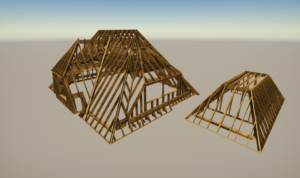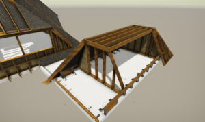 It is a project with a complex prefab timber roof construction with a thatched roof on a house and a garage.