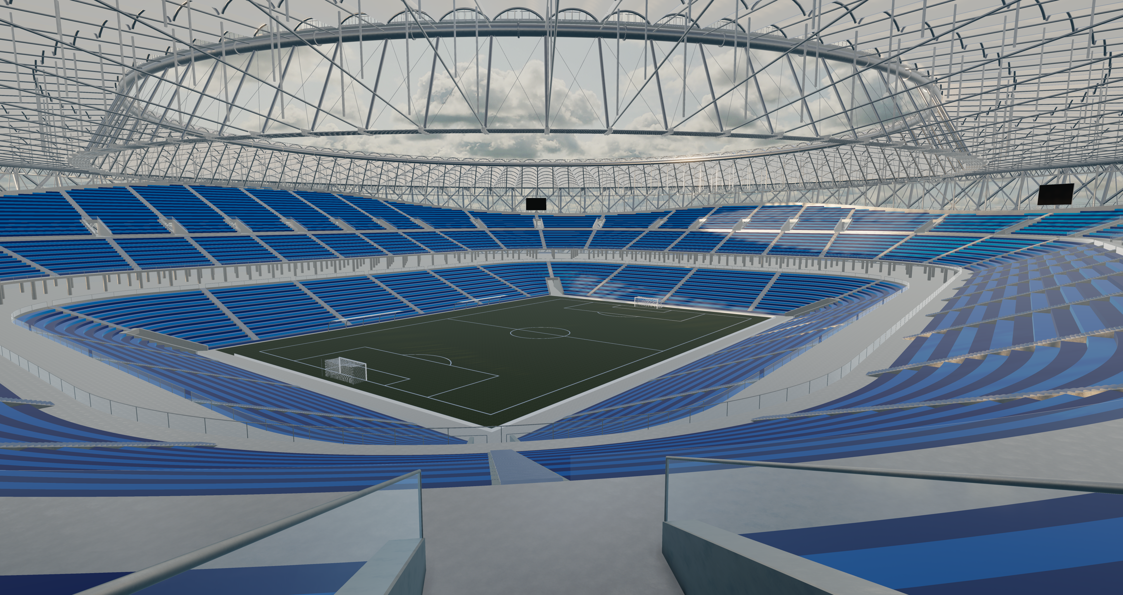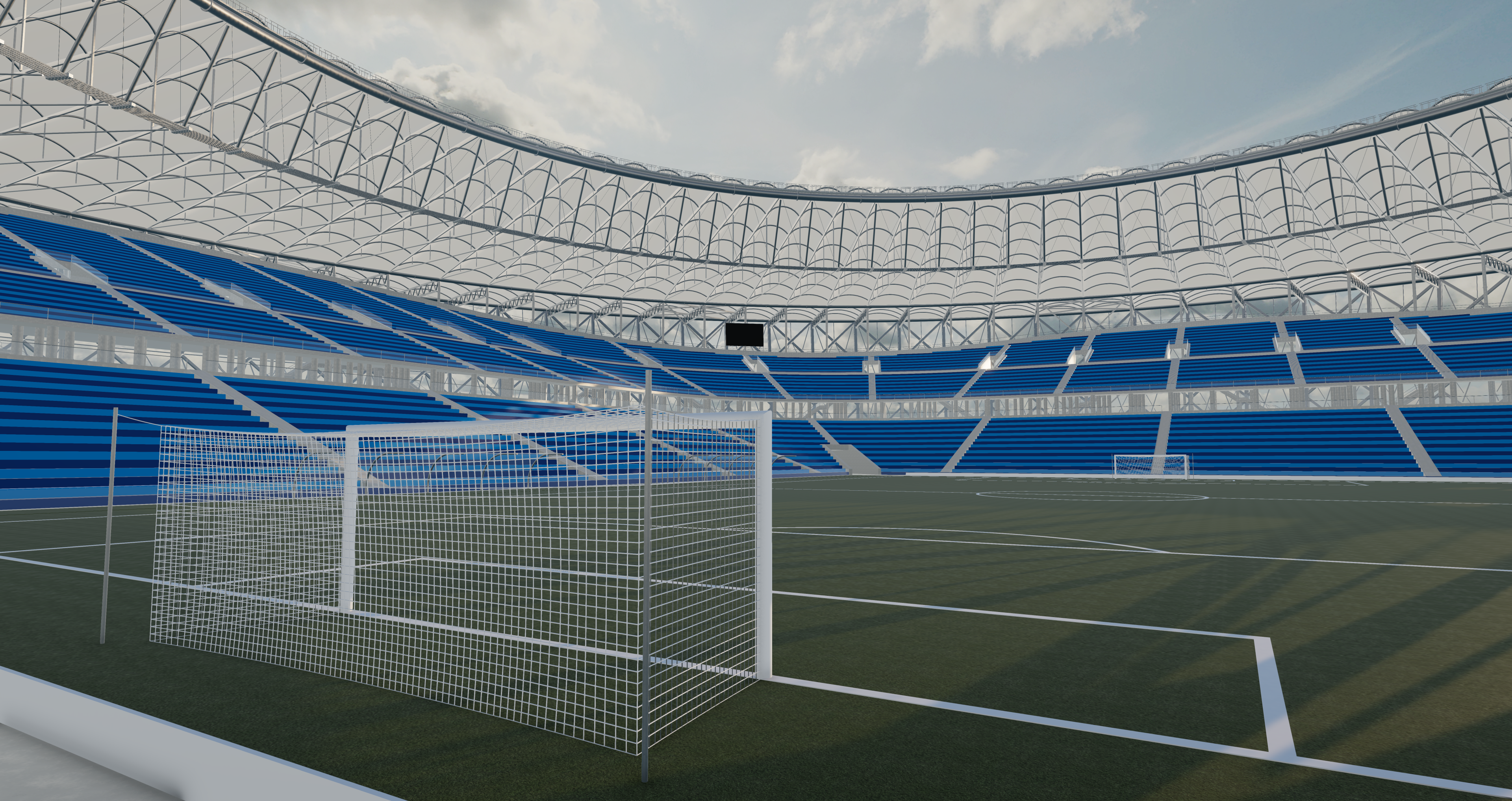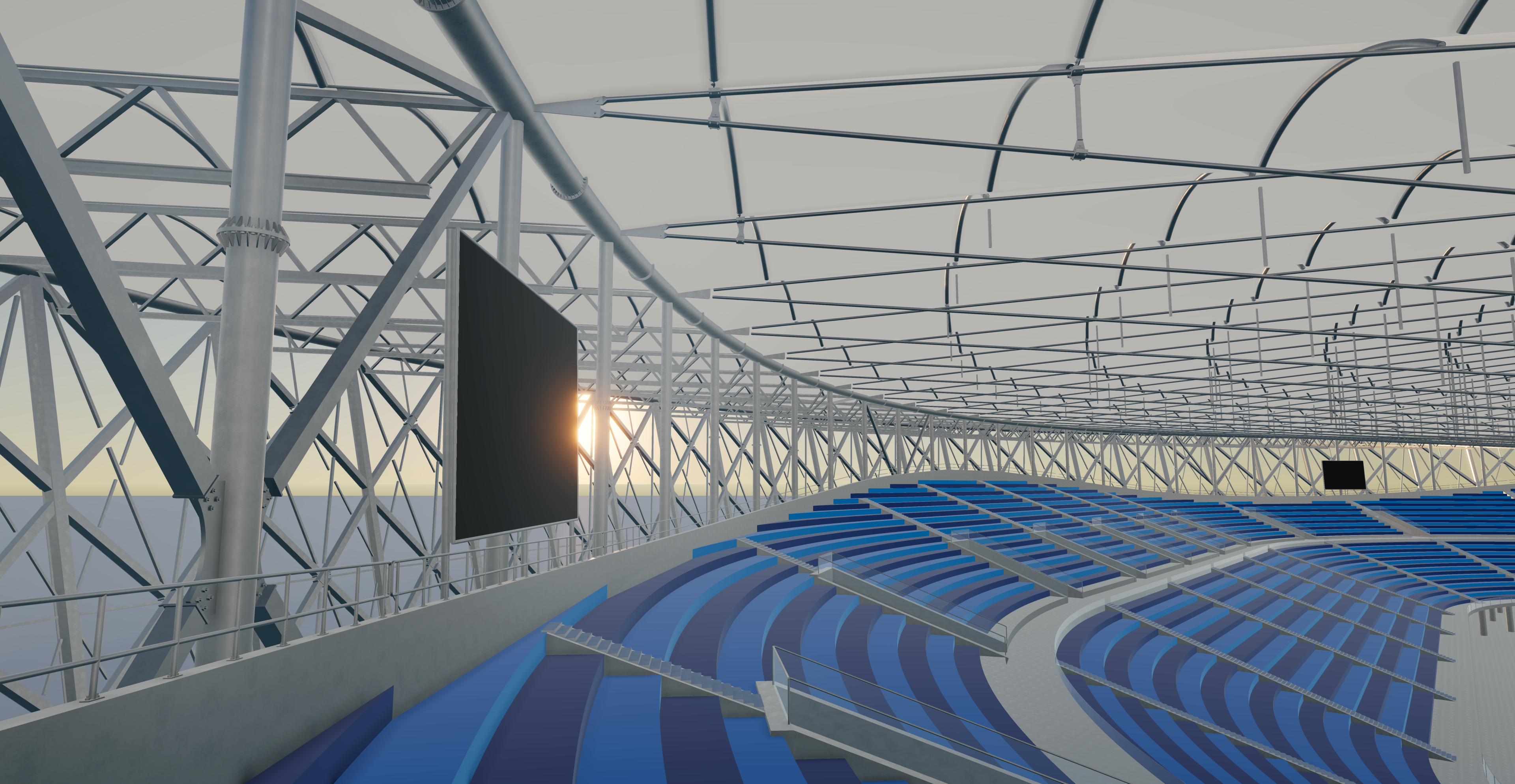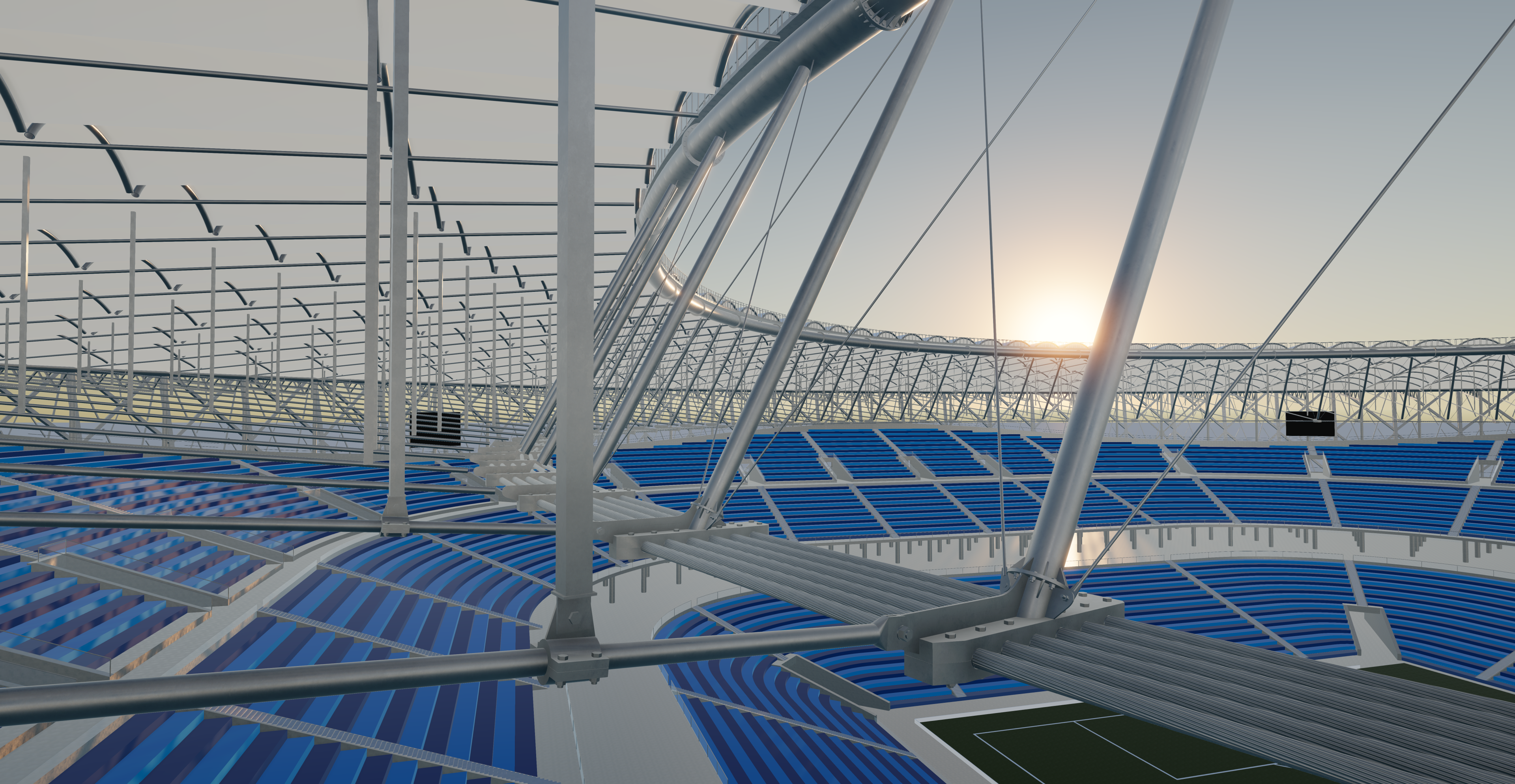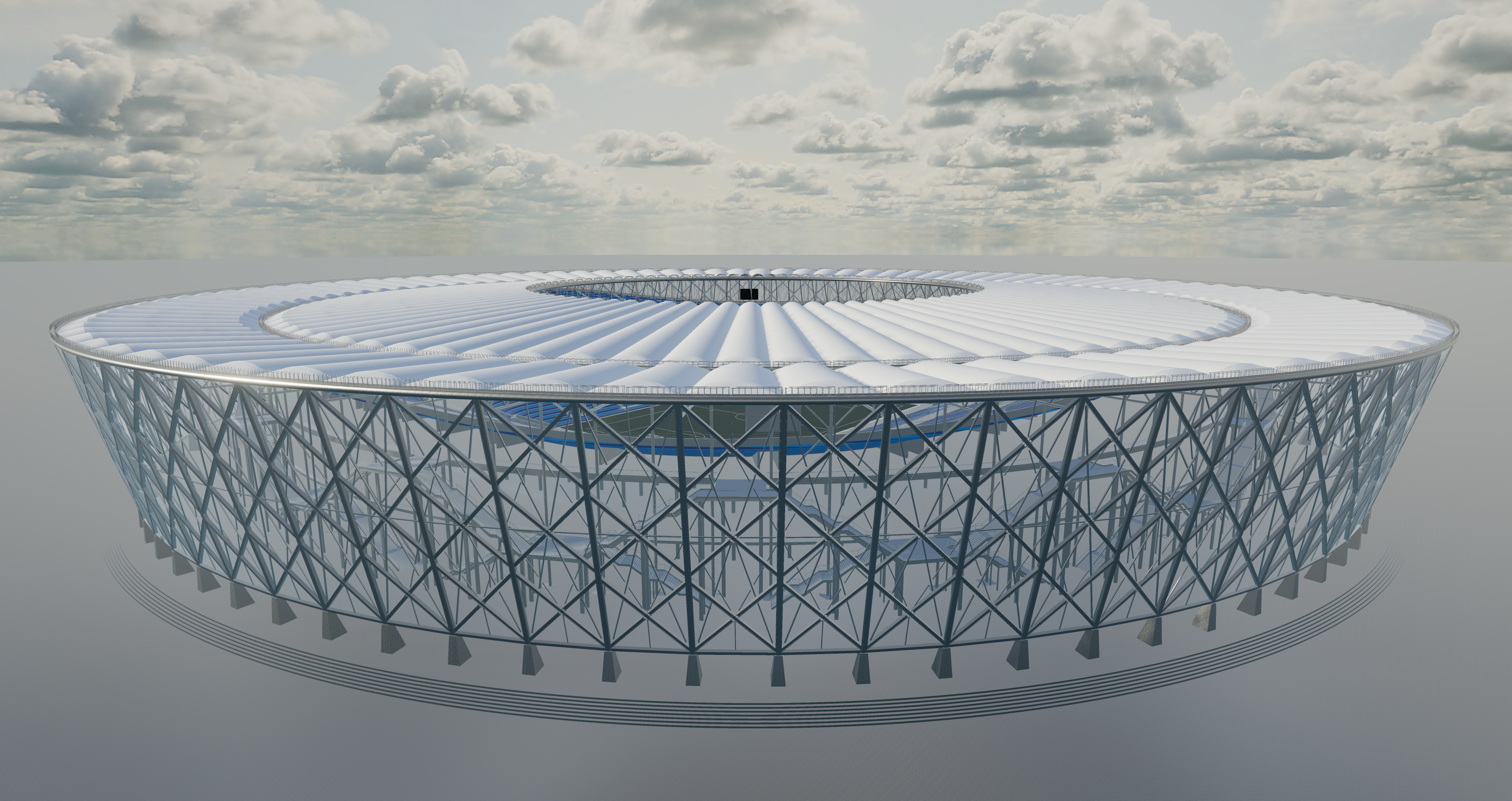The structure is circularly symmetrical, with an outer diameter of 390 meters. It consists of 90 frames arranged at an angular spacing of 4 degrees. These frames include intermediate columns positioned along a circle with a diameter of 310 meters and external columns placed along a circle with a diameter of 370 meters. The intermediate columns support the intermediate ring, while the external columns support the outer ring. Both rings are connected by trusses with a span of 40 meters. The last ring, the central one, consists of a lower part made of six cables and an upper part made of circular profiles. It is connected to the intermediate ring using upper and lower cables, with columns positioned between them. The roof is made of a membrane attached to arch beams placed between the frames.