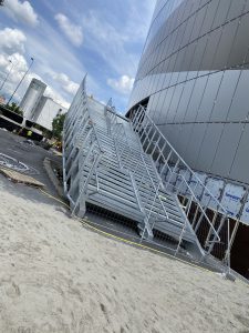 A megbízást tárgyát képező acél menekülő lépcsők formatervezése nem szokványos: A Multifunkcionális csarnok ívét, illetve a burkolati mintákat követve kerültek kialakításra