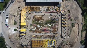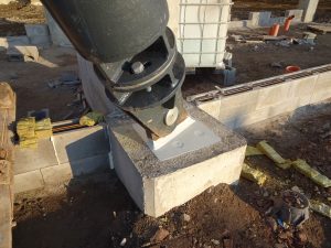Deep-drilled piles were chosen as a foundation on the basis of an engineering-geological survey. The placement of the piles is based on the arrangement of the upper load-bearing structure. The piles are equipped with monolithic reinforced concrete pad footing, which are connected by monolithic reinforced concrete strip footing for the transmission of horizontal forces and in the places where the brick load-bearing perimeter walls are established.