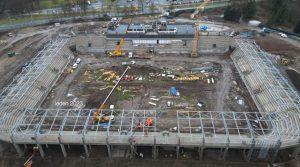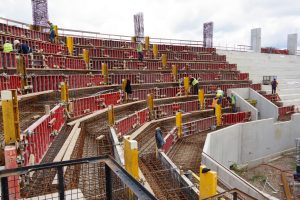 In the transverse direction, the structure of the stands is made up of a monolithic reinforced concrete frame made of three columns and an inclined beam. A monolithic reinforced concrete construction of sloping stands in the shape of steps is placed longitudinally on the frames, which is divided into expansion units. In every other field, there are “moongates” – monolithic reinforced concrete walls with a staircase. The module axes of the transverse frames are 9.6 m apart on the east stand and 10.1 m on the north and south stand.