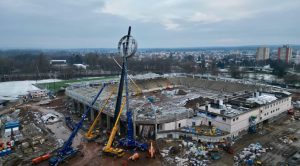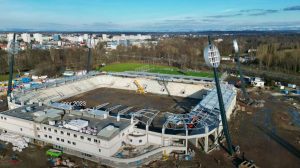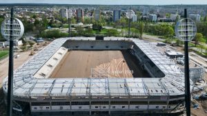 The main supporting element of the steel roof above the stands are galvanized truss-beams with a cantilevered length of approx. 14 m, going from the head of reinforced concrete columns. Trusses are welded from rolled H-shaped cross-sections and diagonals with verticals from rectangular and square hollow cross-sections. The galvanized truss-beam has the shape of a quadrilateral.