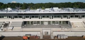 The second (western) part consists of a monolithic reinforced concrete three-story skeleton with a roof structure, a monolithic part of the stands and a galvanized steel roofing structure.