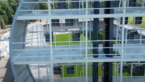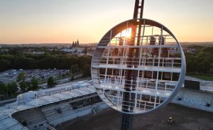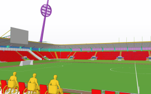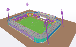 Behind the football targets on the north and south stands there are structures for fixing the flat screens with dimensions of approx. 6.9 x 10.6 m and are attached to two atypical trusses with additional struts and bracings.