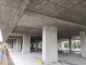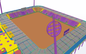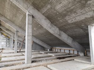 The monolithic reinforced concrete three-story skeleton is made up of vertical columns, stiffening wall stair cores and a ceiling reinforced by headers and flat beams. A separate part is the outdoor VIP monolithic inclined tribunes supported by vertical columns and inclined beams. The basic module system of columns is 8.0m in the longitudinal direction, 5.8m + 7.5m + 5.7m + 5.1m in the transverse direction.
