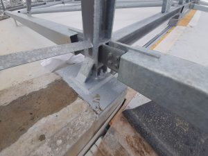 The galvanized trusses of the northern, eastern and southern stands are supported from bottom by galvanized struts of square hollow sections. These struts are located approx. in one-fifth of the cantileverd length of the lower belt os truss and approx. 2 m below the head of the concrete columns.