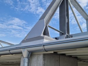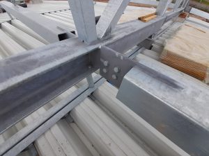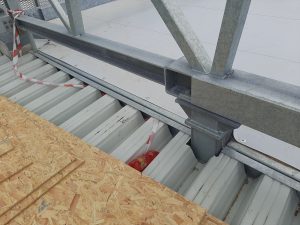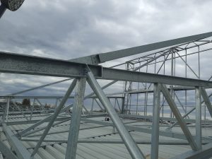 The transition fields of roof at the west stand where the roof slope changes are created using bent galvanized purlins and a skew galvanized beam to support galvanized trapezoidal sheets.