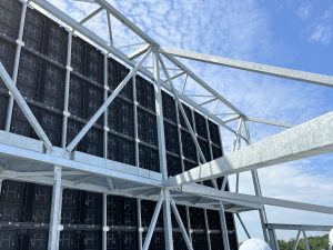Hlavním nosným prvkem ocelového zastřešení tribun jsou pozinkované příhradové nosníky s vyložením cca 14 m jednostranně vykonzolované z hlavy monolitických ŽB sloupů. Vazníky jsou svařeny z válcovaných průřezů tvaru H a diagonály se svislicemi z uzavřených obdélníkových a čtvercových průřezů. Pozinkovaný vazník má tvar ležatého čtyřúhelníku, jehož výška je největší nad hlavou ŽB sloupu, na kterou je připevněn, a na konci vyložení je výška nejmenší. Nad sloupem je výška cca 1 700 mm. Nestejná výška základen umožní vyspádování střešní roviny umístěné pod spodním pasem vazníku směrem k vnějšímu obrysu tribun.