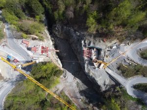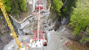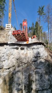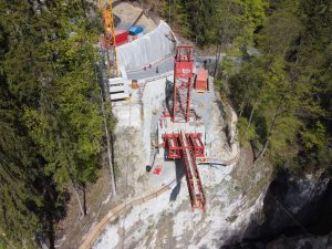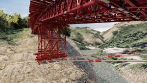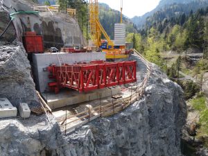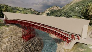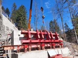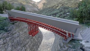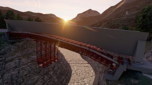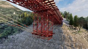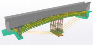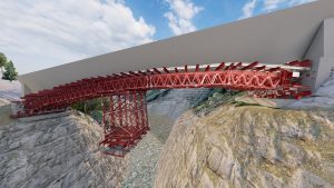Due to the Dornbirner Ache running below, a free-span shoring had to be used to build the bridge. Appropriate bearing surfaces were provided below the abutments for this purpose. Due to the limited accessibility due to the very narrow access road, a shoring system that was as light as possible had to be developed. The maximum weight of the individual parts in the crown area is limited to approx. 4 tons and the maximum length of the components that can be delivered via the existing road is 12 m. Due to these boundary conditions, a technically very complex shoring had to be developed. We then developed a gently sloping arch support structure consisting of 3 truss tubes. The lattice trusses are restrained to the transoms for assembly and to increase the load-bearing capacity. To ensure the static load-bearing capacity in the concreting state, the shoring also had to be braced with tie rods.