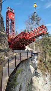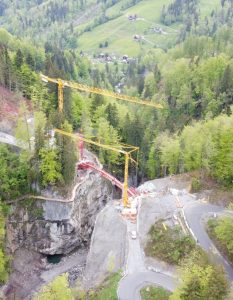 Aufgrund der darunter verlaufenden Dornbirner Ache musste zur Herstellung der Brücke war ein freigespanntes Traggerüst eingesetzt werden. Dazu wurden unterhalb der Widerlager entsprechende Auflagerflächen vorgesehen. Infolge der eingeschränkten Zugänglichkeit zufolge der sehr schmalen Zufahrtsstraße, musste ein möglichst leichtes Traggerüst entwickelt werden. Die Maximalgewichte der Einzelteile im Scheitelbereich sind mit ca. 4to begrenzt und die maximale Länge der Bauteile, welche über die vorhandene Straße angeliefert werden können, beträgt 12m. Anlässlich dieser Randbedingungen musste ein technisch sehr aufwendiges Traggerüst entwickelt werden. Wir haben in weiterer Folge ein flach geneigtes Bogentraggerüst, bestehend aus 3 Fachwerkbinderröhren entwickelt. Zur Montage und Erhöhung der Tragfähigkeit sind die Fachwerkbinder an den Kämpfern eingespannt. Zur Gewährleistung der statischen Tragfähigkeit im Betonierzustand musste das Traggerüst ebenfalls noch mit Zugankern unterspannt werden.
