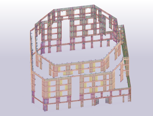 Nasza firma odpowiadała za model obliczeniowy, model BIM o bardzo wysokim poziomie szczegółowości wraz z wszelkimi potrzebnymi rysunkami oraz koordynacje z innymi branżami. Konstrukcja monolityczna wraz z pozostałymi niepokazanymi na modelu branżami została wykonana przez innych podwykonawców.