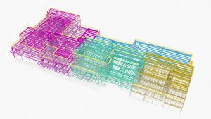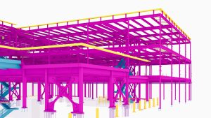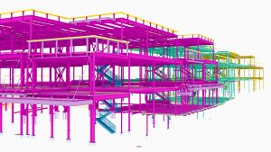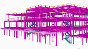 Projekt został w pełni zamodelowany i uszczegółowiony przy użyciu Tekla, a eksport modeli odegrał kluczową rolę w opracowaniu projektu we współpracy z inżynierami i architektem. Projekt stanowił szereg unikalnych wyzwań konstrukcyjnych, szczególnie ze względu na obecność podłóg o różnych wysokościach płyt. Jeden z bardziej złożonych aspektów obejmował detalowanie (6) stalowych wież schodowych, każda z podestami i balustradami schodowymi, a także schody z dwoma biegami z bramą. Z punktu widzenia detali, projekt obejmował kilka zaawansowanych i złożonych elementów konstrukcyjnych: