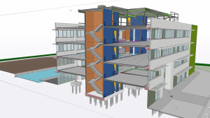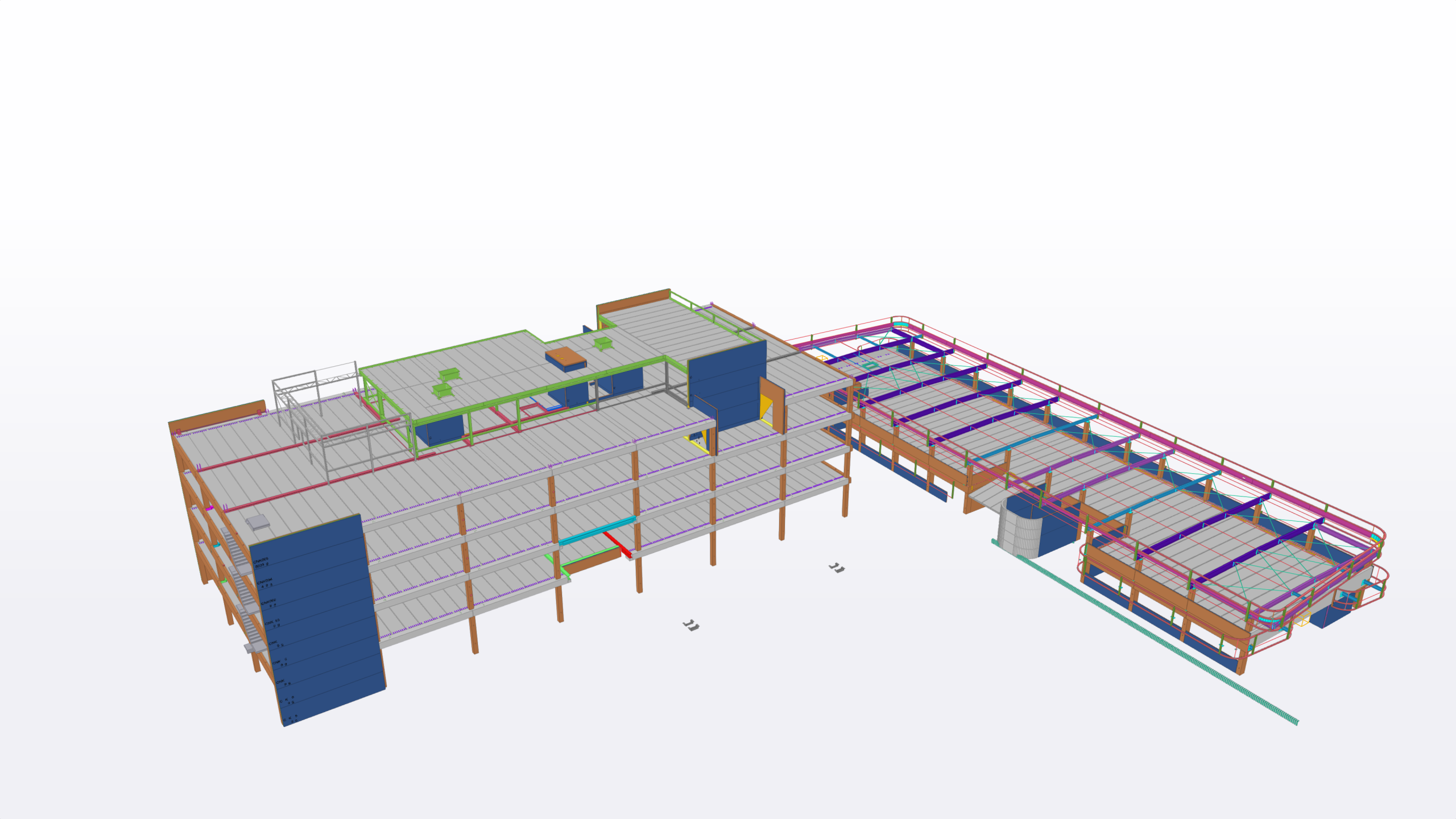 Met Tekla Structures werden de productiemodellen opgemaakt voor staalconstructie en betonconstructie (kolommen, volle en geïsoleerde wanden) en uitgewerkt tot Productietekeningen, hoeveelheden, lijsten, machinesturingen,… voor onze eigen productiesites Meco Metal en LG-Beton.