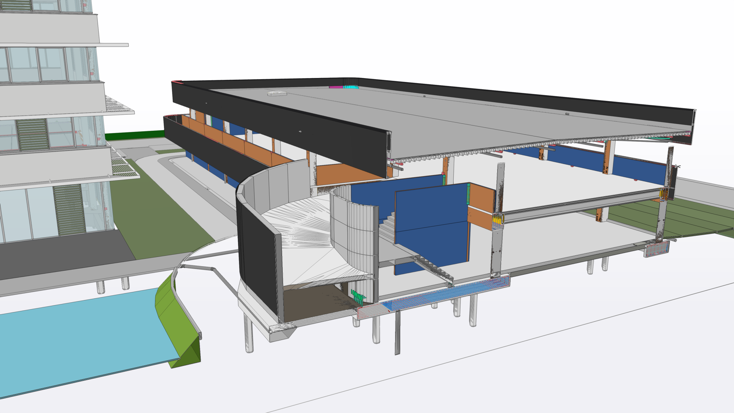 Tekla Structures was used to develop detailed production models for both the steel and concrete structures, including columns, solid walls and insulated wall elements. These models were further elaborated into production drawings, quantity take-offs, material lists and machine control data for our own production facilities, Meco Metal and LG-Beton.