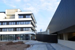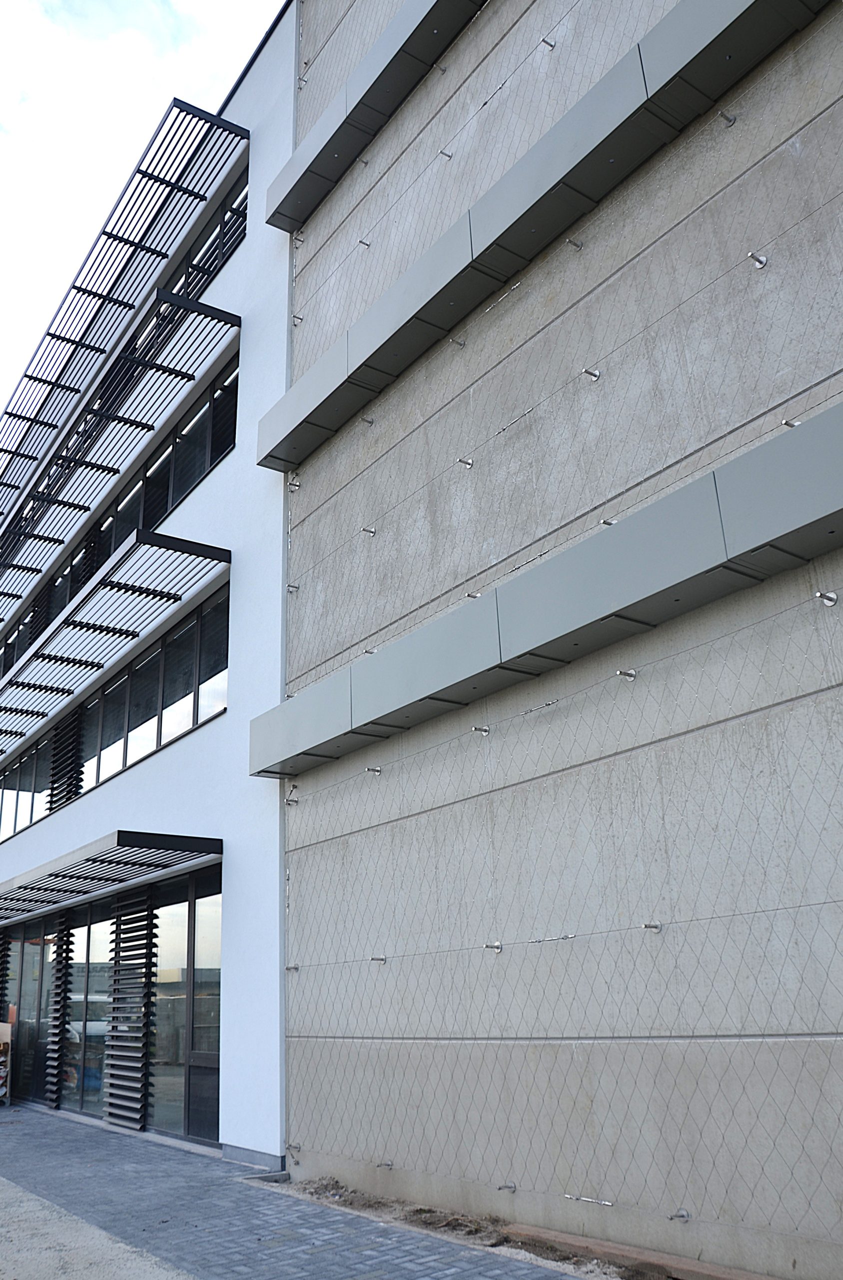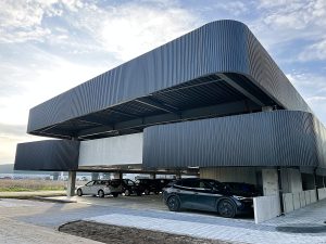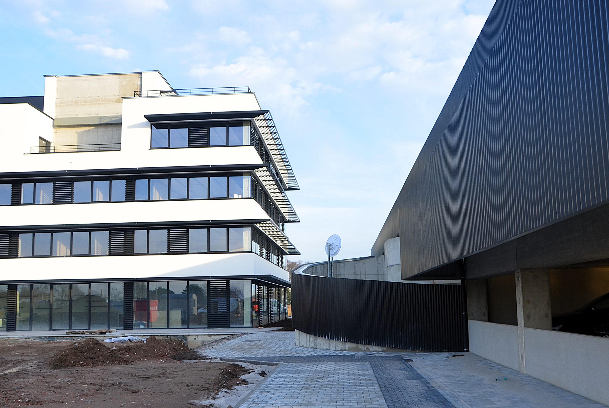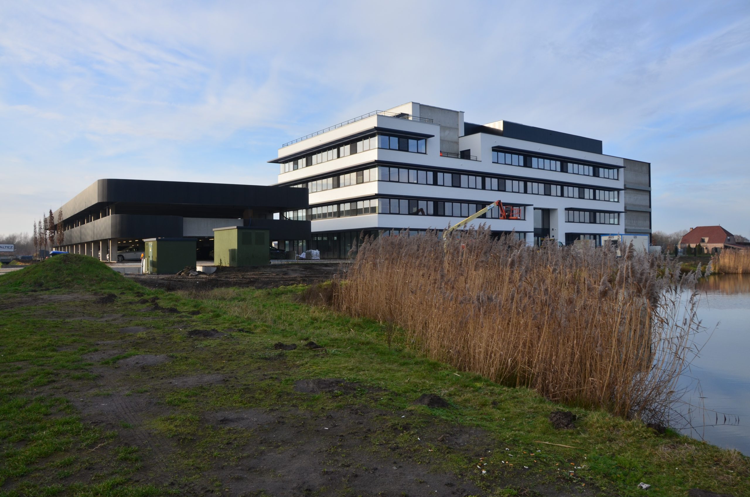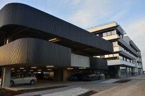The campus consists of a five-storey office building, complemented by a separate parking structure, and was designed as a modern, flexible and future-oriented working environment. The building structure combines a steel framework with prefabricated concrete elements. This hybrid construction approach made it possible to achieve both a fast execution and a high level of prefabrication, while ensuring an efficient organization of production and on-site assembly. In addition to the structural design, strong emphasis was placed on sustainability and user comfort. Green roofs and green façades contribute to water retention and give the building a distinctive, ecological character. Large glazed areas create an open and light-filled working environment, while well-designed solar shading and energy-efficient building systems ensure a comfortable indoor climate and low energy consumption.