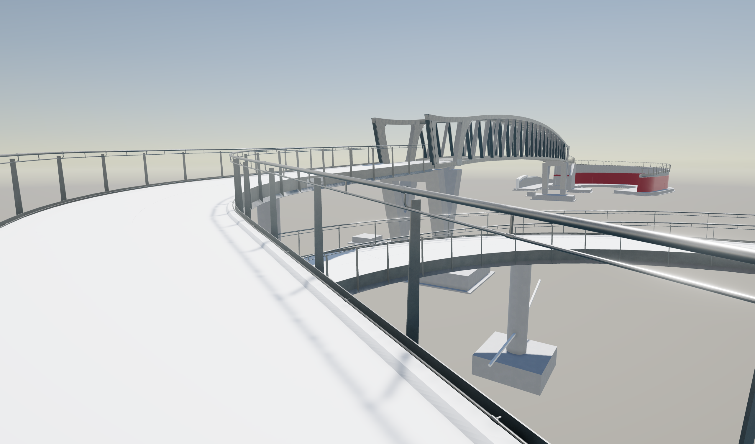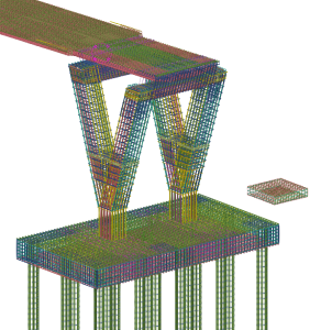 Alle betonnen onderdelen – inclusief bekisting en wapening – werden tot in uitvoeringsdetail gemodelleerd in Tekla Structures. Het inwerken van de instortrails voor de leuningen en de deuvels van de brug zelf werden ook geïmplementeerd in het 3D-model. De complexe geometrie van de aanrijhellingen zorgde hierbij voor een bijzondere uitdaging, vooral door het gebruik van gebogen wapeningsstaven en de hoge wapeningsdensiteit.