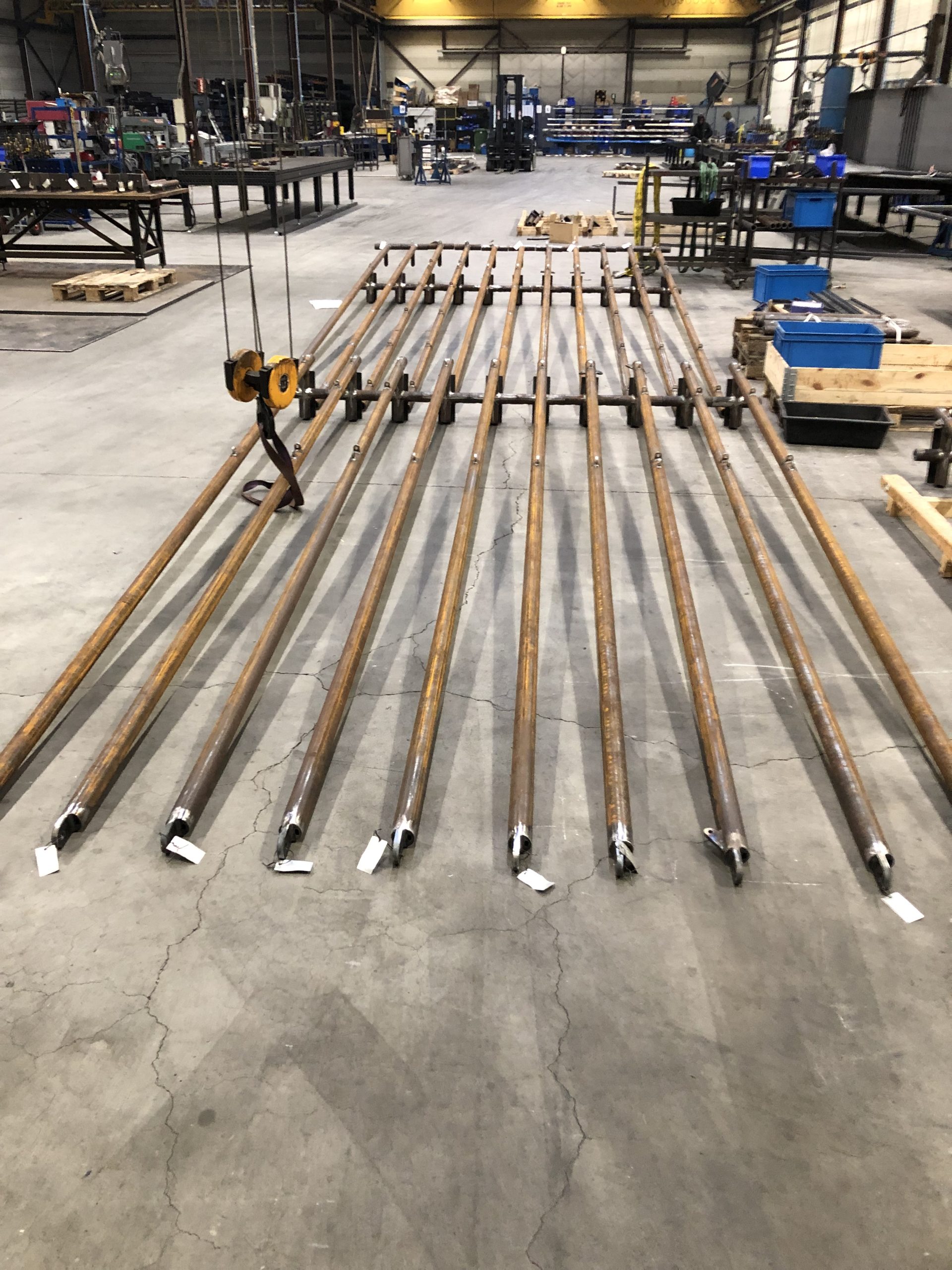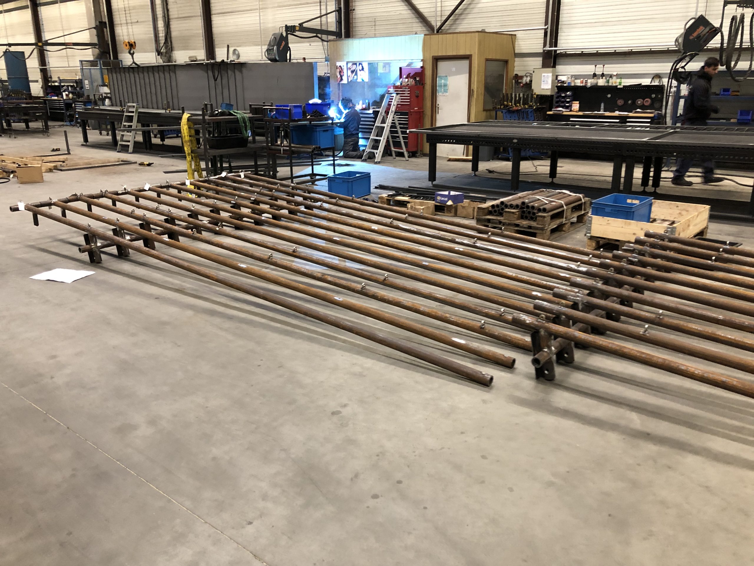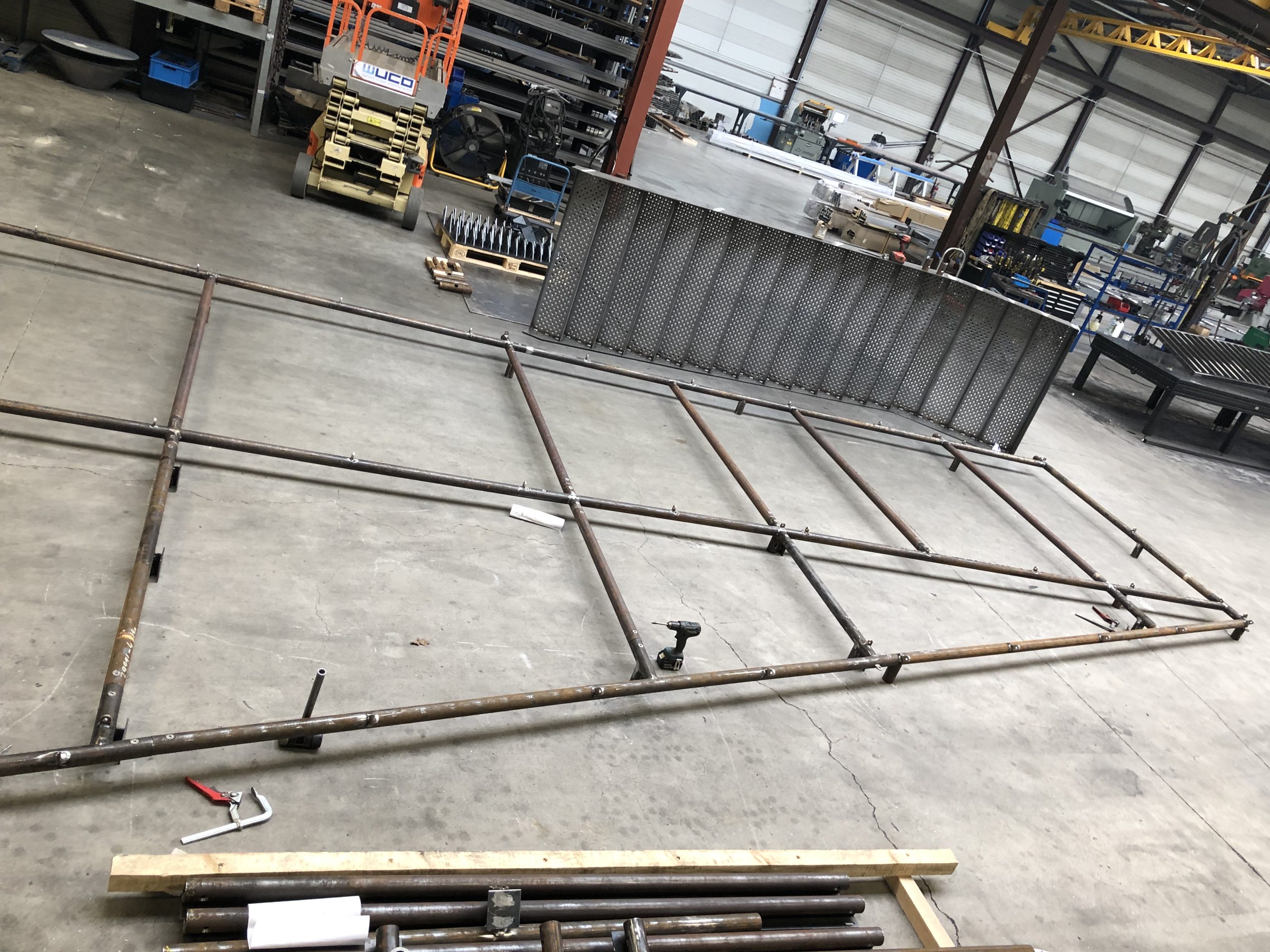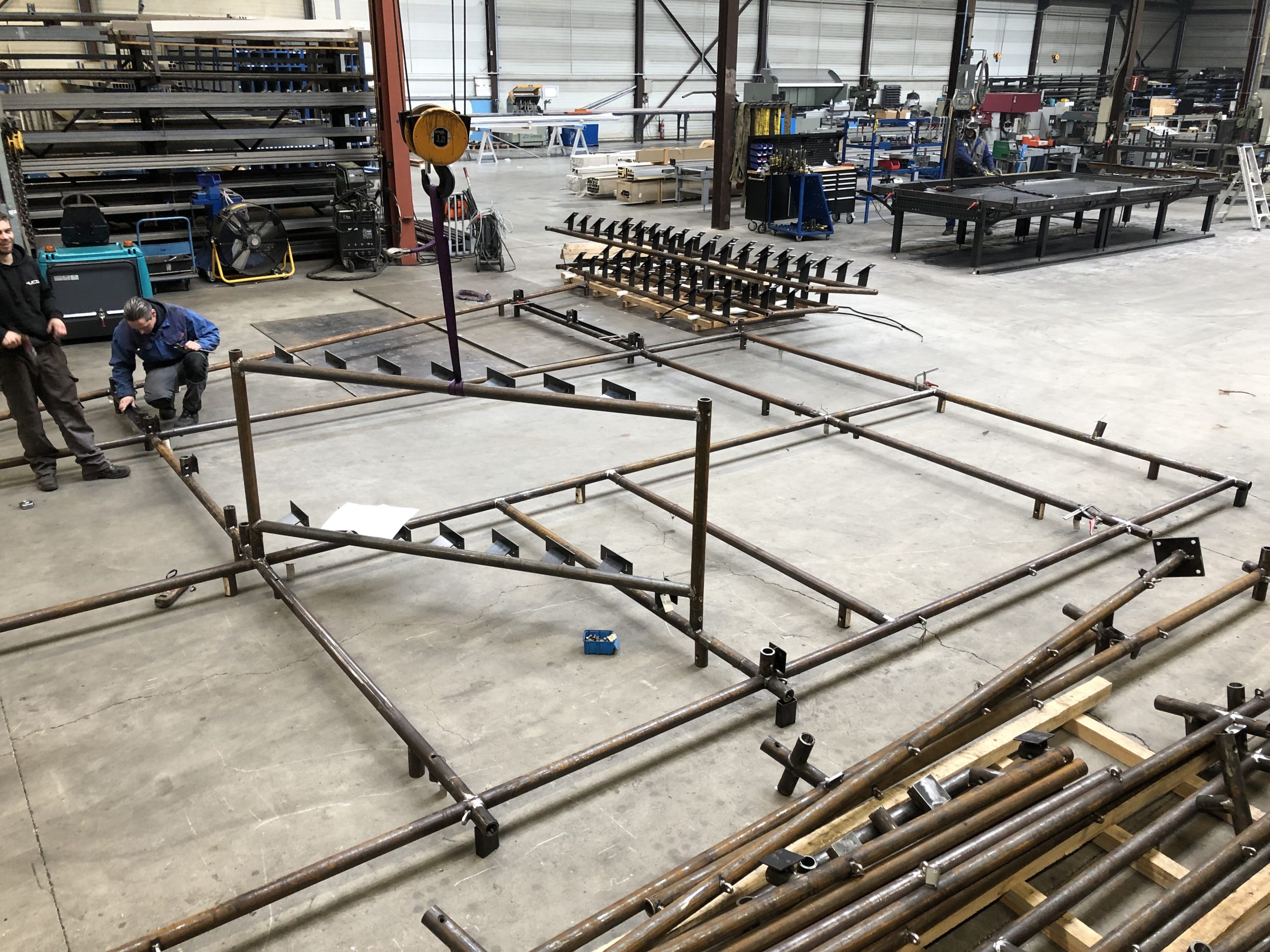 De staalstructuur rondom het gebouw bestaat grotendeels uit stalen buizen met een totaalgewicht van circa 12T. De structuur moest vak per vak opgebouwd worden zodat deze als een ‘jas’ rond de bestaande betonbouw geplaatst werd. Hiervoor was een nauwkeurige afstemming van alle koppelingen en secties nodig. Dit was een grote uitdaging binnen dit project. Elk knooppunt moest juist zitten. Een afwijking in één element zou meteen gevolgen hebben voor alle aansluitende delen. Dankzij de slimme inzet van de Tekla-software konden we de verbindingen van de componenten perfect voorbereiden.