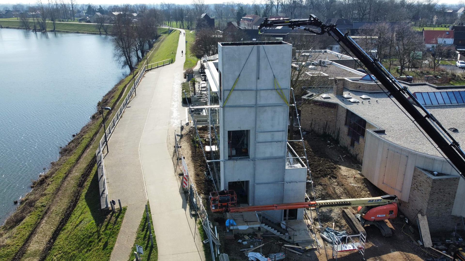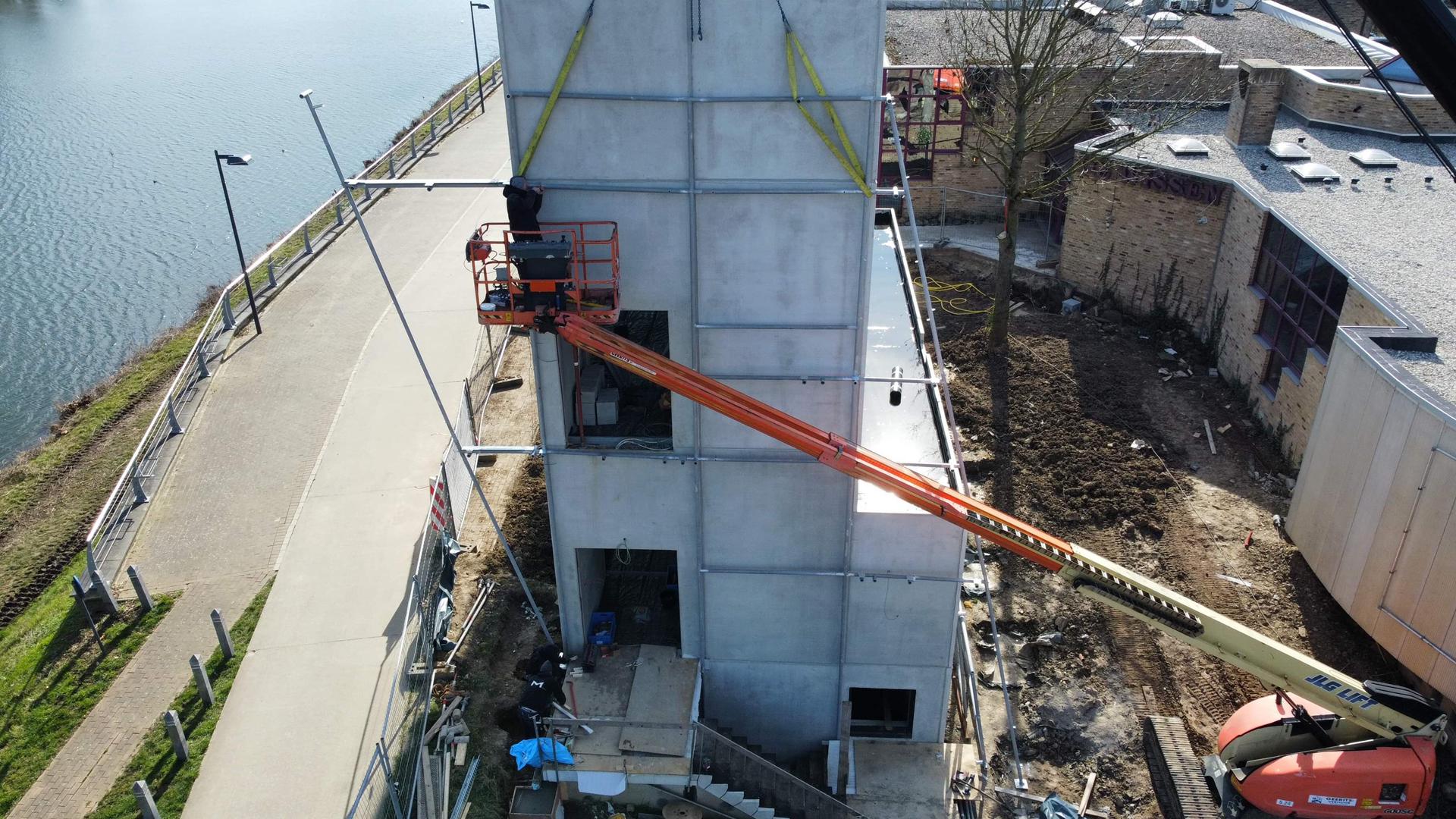De structuur moest sectie per sectie gemaakt worden omdat de volgorde van het ontwerp gerespecteerd moest blijven. Op productieniveau werd dit al volledig samengesteld. Zo konden we de koppelingen controleren, toleranties finetunen en eventuele productiefoutjes uitsluiten. Dankzij deze voorbereiding verliep de montage op de werf bijzonder vlot. Het volledige staalvolume moest perfect op elkaar aansluiten, wat een enorme uitdaging was en waar tijdens de ontwerpfase al rekening mee gehouden moest worden. Bevestigingspunten werden bewust verzonken aangebracht om een strak resultaat te bekomen zonder zichtbare boutkoppen. Tijdens het montageproces werd de structuur sectie per sectie opgebouwd op de grond en vervolgens in z’n geheel met een kraan tegen het gebouw geplaatst.. De positie van de eerste sectie is volledig bepalend voor het passen en aansluiten van de daaropvolgende secties. Daarom zijn de bevestigingspunten met de nodige precisie uitgezet. De eerste sectie bepaalde vervolgens de volledige richting van het gebouw. De eerste sectie en de eerste bevestigingspunten bepaalde de volledige richting van het gebouw. Het eindresultaat is een stalen omhulling die het gebouw volledig rondom omvat.