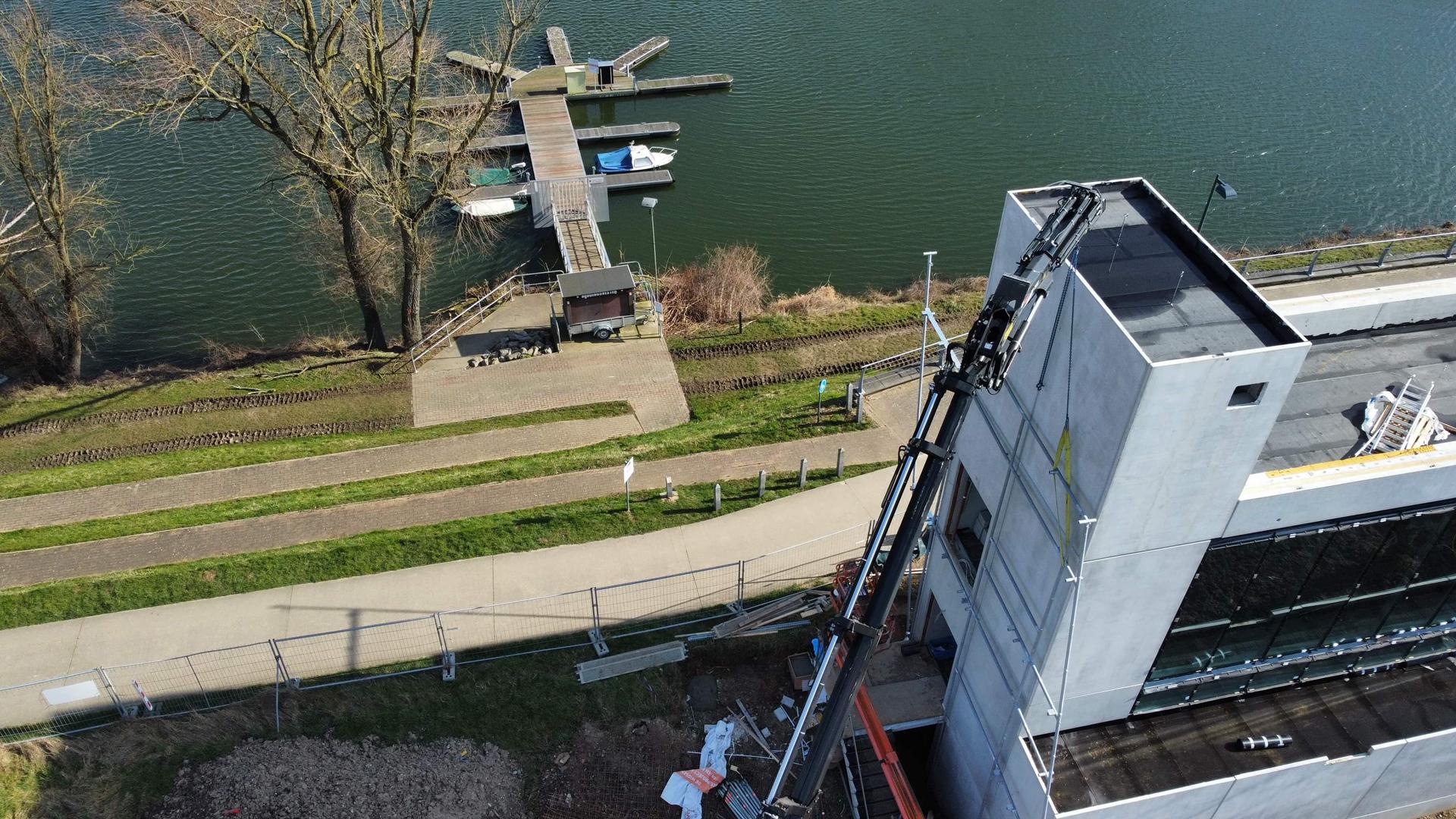 The steel structure around the building consists largely of steel tubes with a total weight of approximately 12T. The structure had to be built box by box so that it was placed like a “jacket” around the existing concrete building. This required precise alignment of all joints and sections. This was a major challenge within this project. Every junction had to sit correctly. A deviation in one element would immediately affect all connecting sections. Thanks to the clever use of Tekla software, we were able to prepare the connections of the components perfectly.