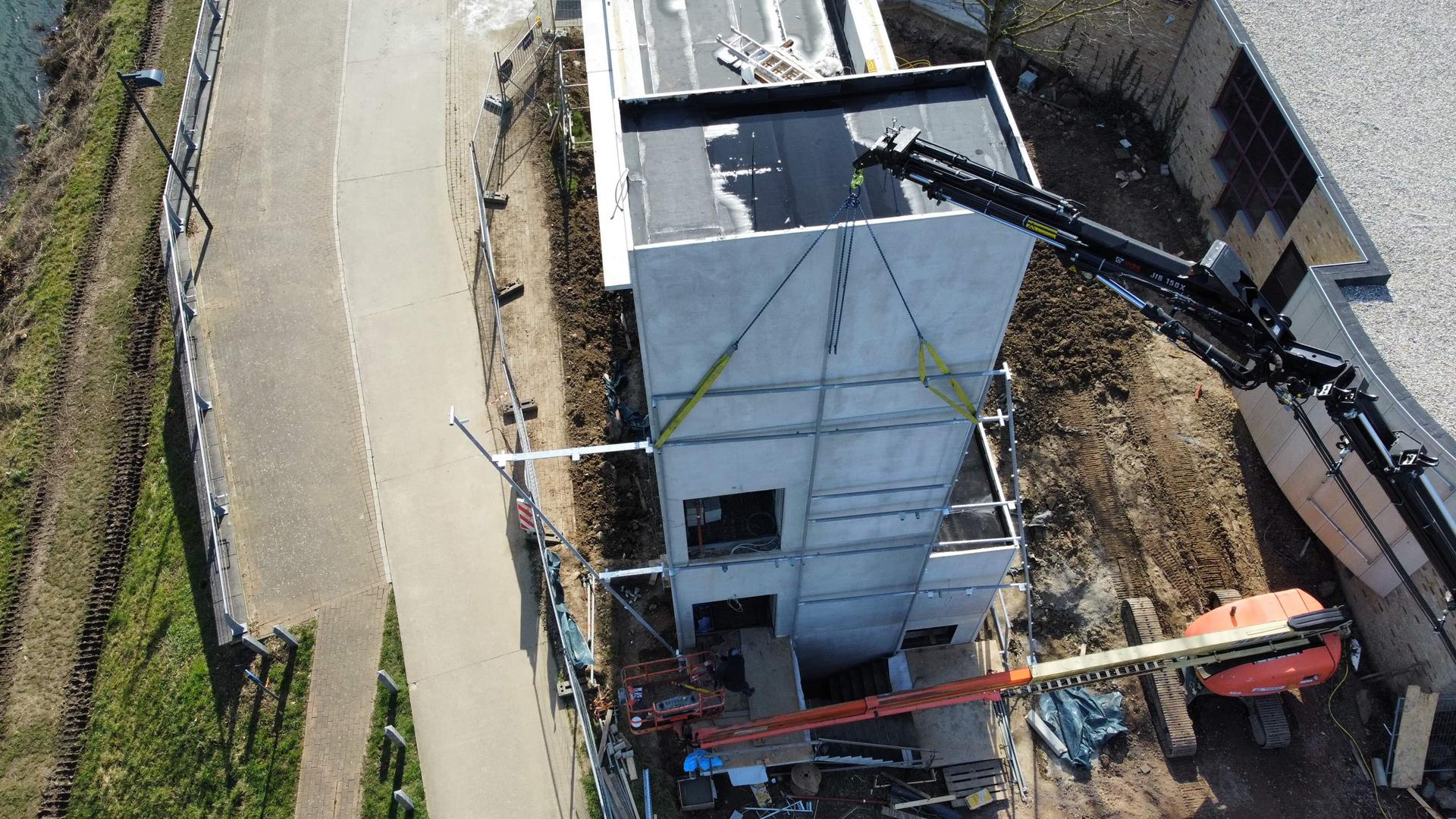 The structure had to be made section by section because the order of the design had to be respected. At the production level, this was already fully assembled. This allowed us to check the couplings, fine tune tolerances and exclude any production errors. Thanks to this preparation, assembly on site went particularly smoothly. The entire steel volume had to fit together perfectly, which was an enormous challenge that had to be taken into account during the design phase. Fixing points were deliberately installed countersunk to achieve a tight result with no visible bolt heads. During the assembly process, the structure was built section by section on the ground and then placed against the building in its entirety by crane. The position of the first section completely determines the fit and connection of the subsequent sections. Therefore, the attachment points were plotted with precision. The first section then determined the entire direction of the building. The first section and the first attachment points determined the full direction of the building. The end result is a steel envelope that encloses the building all the way around.