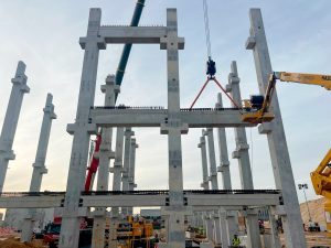 • Precast portal frame structure with rigid connections using Peikko-type mechanical couplers between column/foundation and column/beam;