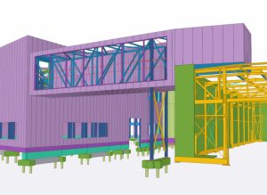De twee bruggen die de bestaande gebouwen met de nieuwbouw verbinden, evenals de structuur van de voorgevel op niveau +2 en +3, moesten vooraf op de grond worden gemonteerd. Deze elementen werden vervolgens in één geheel geplaatst. Zo werd de voetgangersbrug van 33 x 2,7 x 3 meter (l x b x h), volledig geprefabriceerd en in één stuk gemonteerd. Daarnaast moesten alle vrije hoogtes, vides en doorgangen strikt gerespecteerd worden, zodat de klant zonder problemen machines, goederenliften en rolbruggen kan plaatsen, zonder dat deze in conflict komen met de dragende structuur.