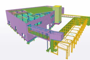 The two bridges that connect the existing buildings to the new one, as well as the front façade structure on levels +2 and +3, had to be preassembled on the ground. These elements were then installed in one piece. The pedestrian bridge, measuring 33 x 2.7 x 3 meters (L x W x H), was fully prefabricated and mounted in a single piece. In addition, all free heights, voids, and passageways had to be strictly respected so that the client can install machines, freight elevators, and overhead cranes without interference from the load-bearing structure.