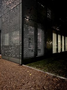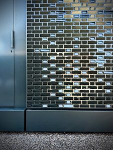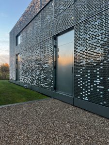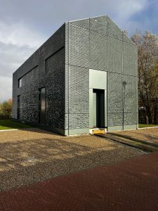 De vloeren, opgehangen in de constructie, bieden ruimte aan alle installaties. De vrij indeelbare binnenwanden zorgen voor maximale flexibiliteit. De gevel gekenmerkt door grote, verlijmde glasvlakken, wordt omlijst door een uniek patroon van MD Formatura panelen. Geïnspireerd op het Vlaamse metselwerkverband en parametrisch ontworpen, vormen deze panelen een dynamische, golvende huid die esthetiek, zonwering, daglichttoetreding en privacy verenigt.