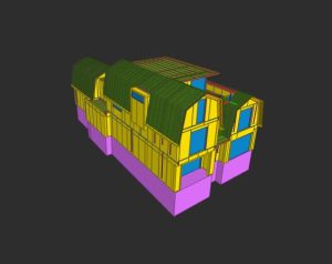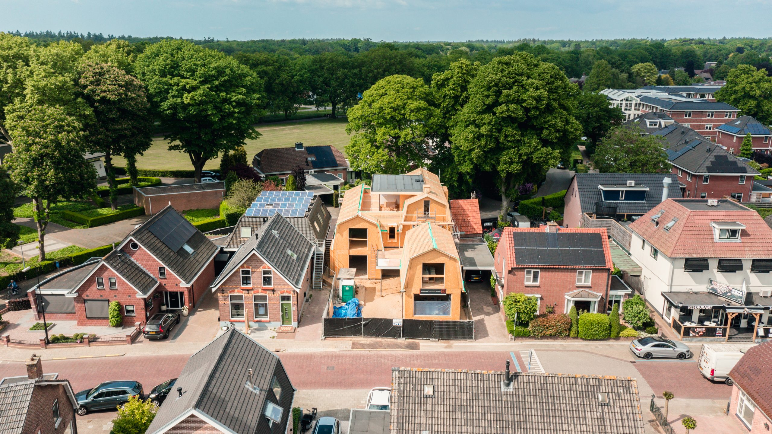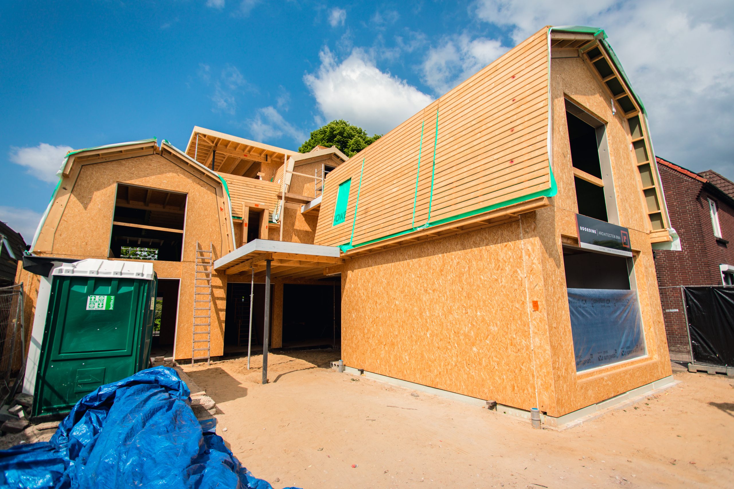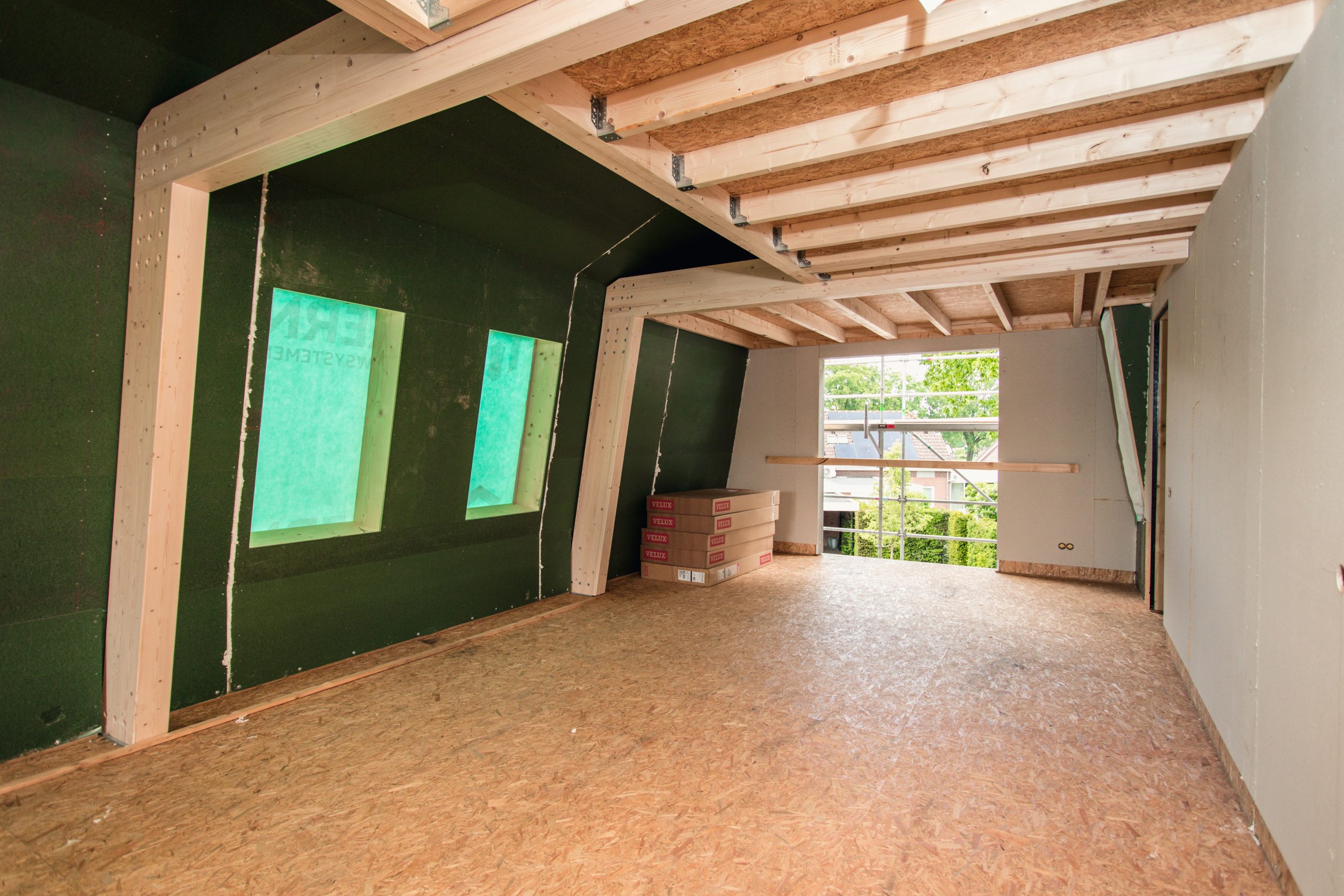 Door te kiezen voor prefab-elementen krijgt dit project bovendien een duurzaam karakter. Het combineren van SIP’s, HSB, gelamineerde spanten en staalwerk in de beperkte ruimte op de bouwplaats zorgde voor een efficiënte en duurzame uitvoering.