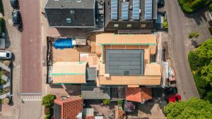 By opting for prefabricated elements, this project also gains a sustainable character. Combining SIPs, HSB, laminated trusses, and steelwork within the limited space on the construction site ensured an efficient and sustainable execution.