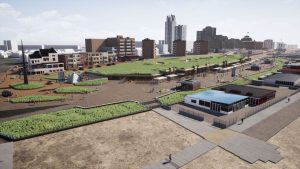 Next to the boulevard of Scheveningen is the construction site of a parking garage with stores attached to it. These stores are placed around the parking garage.