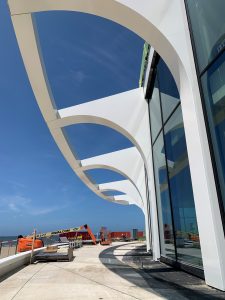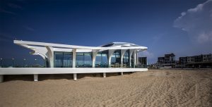 On the beach in Scheveningen, near the turning loop at the end of the Gevers Deynootweg, J.P. van Eesteren has realised an iconic three-storey beach pavilion. The design is by Bureau voor Stedebouw en Architectuur Wim de Bruijn BV and is inspired by the shapes of the beach and the sea. The destination? A unique entertainment attraction point as the beginning of the new boulevard at Scheveningen’.