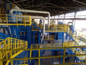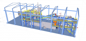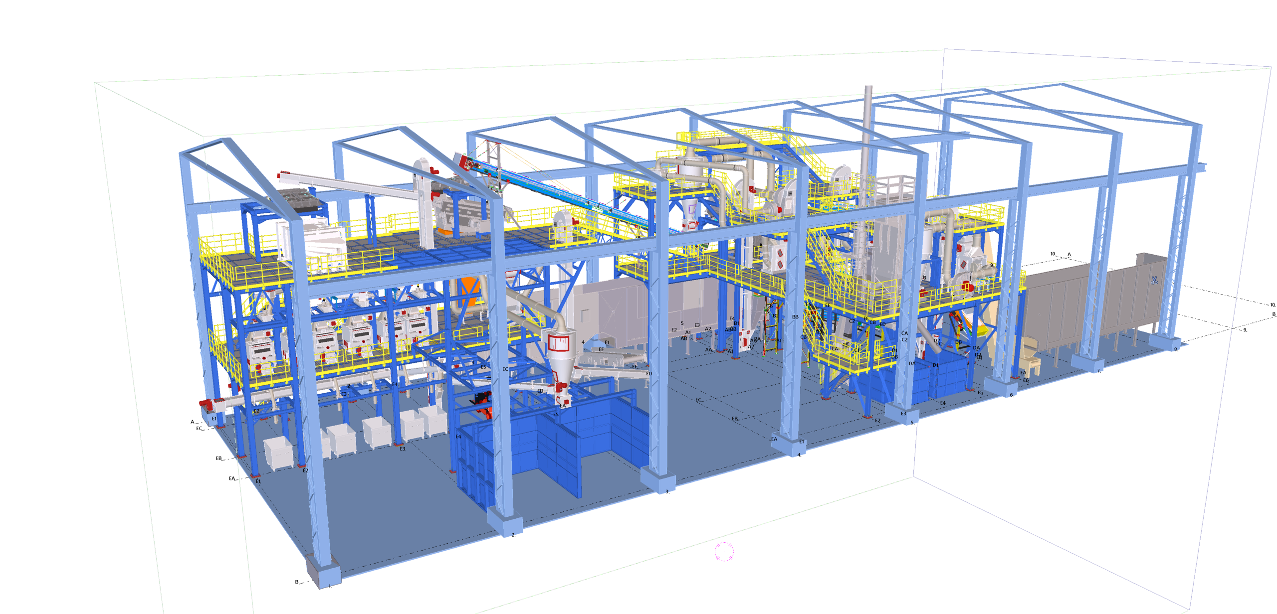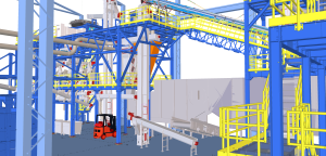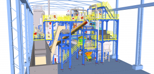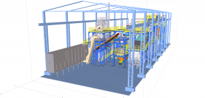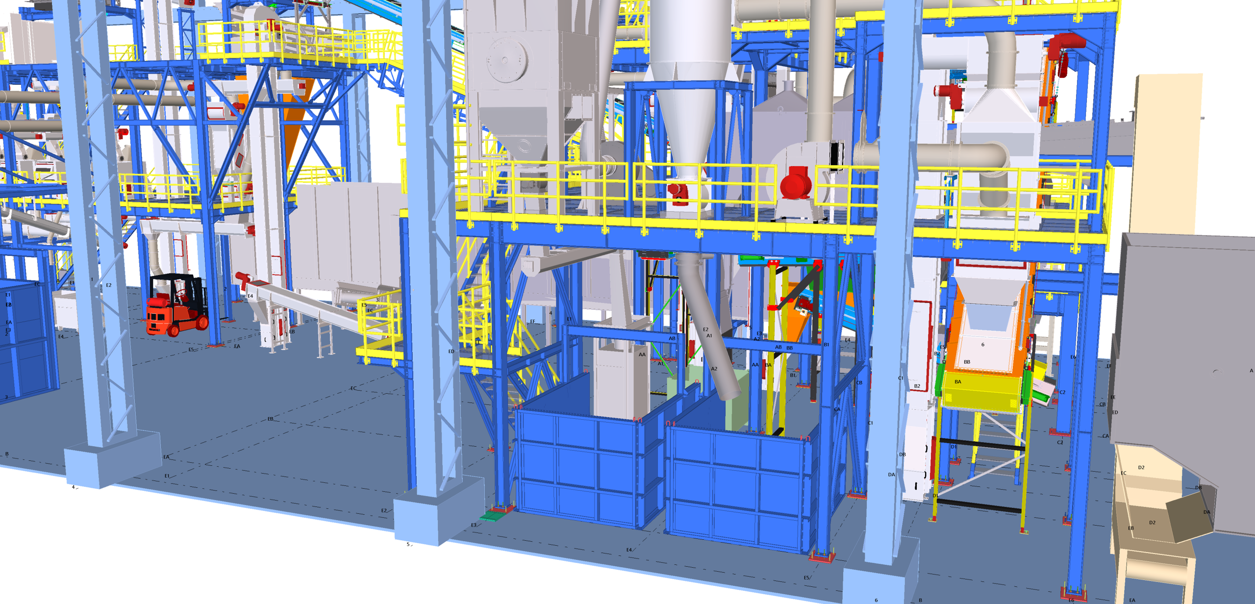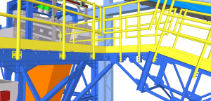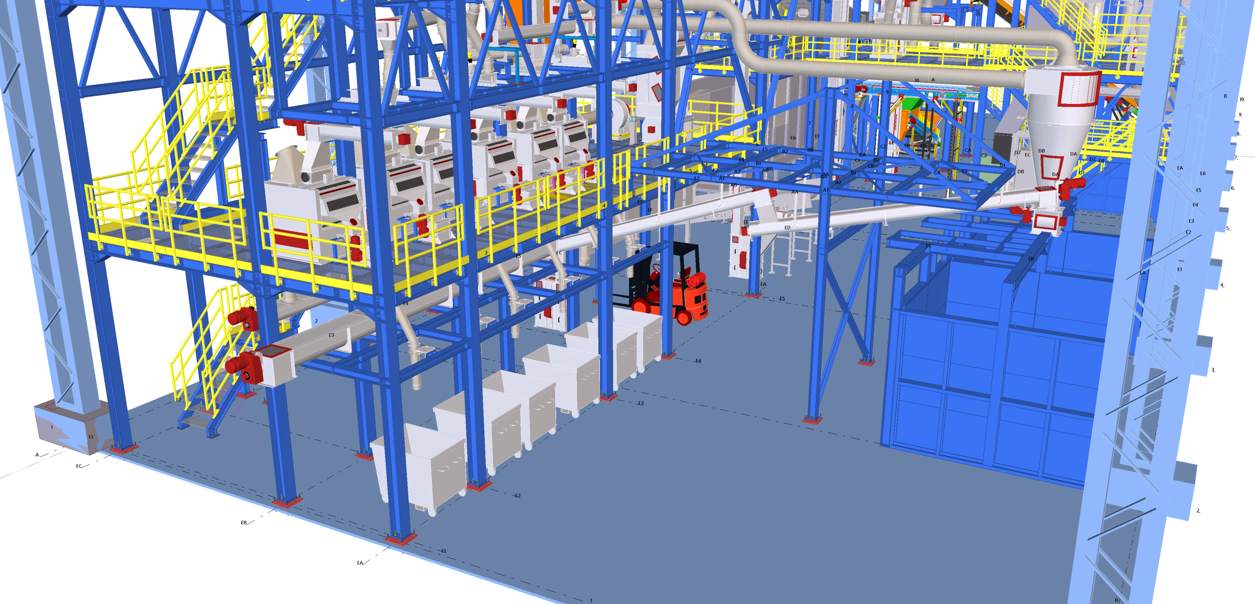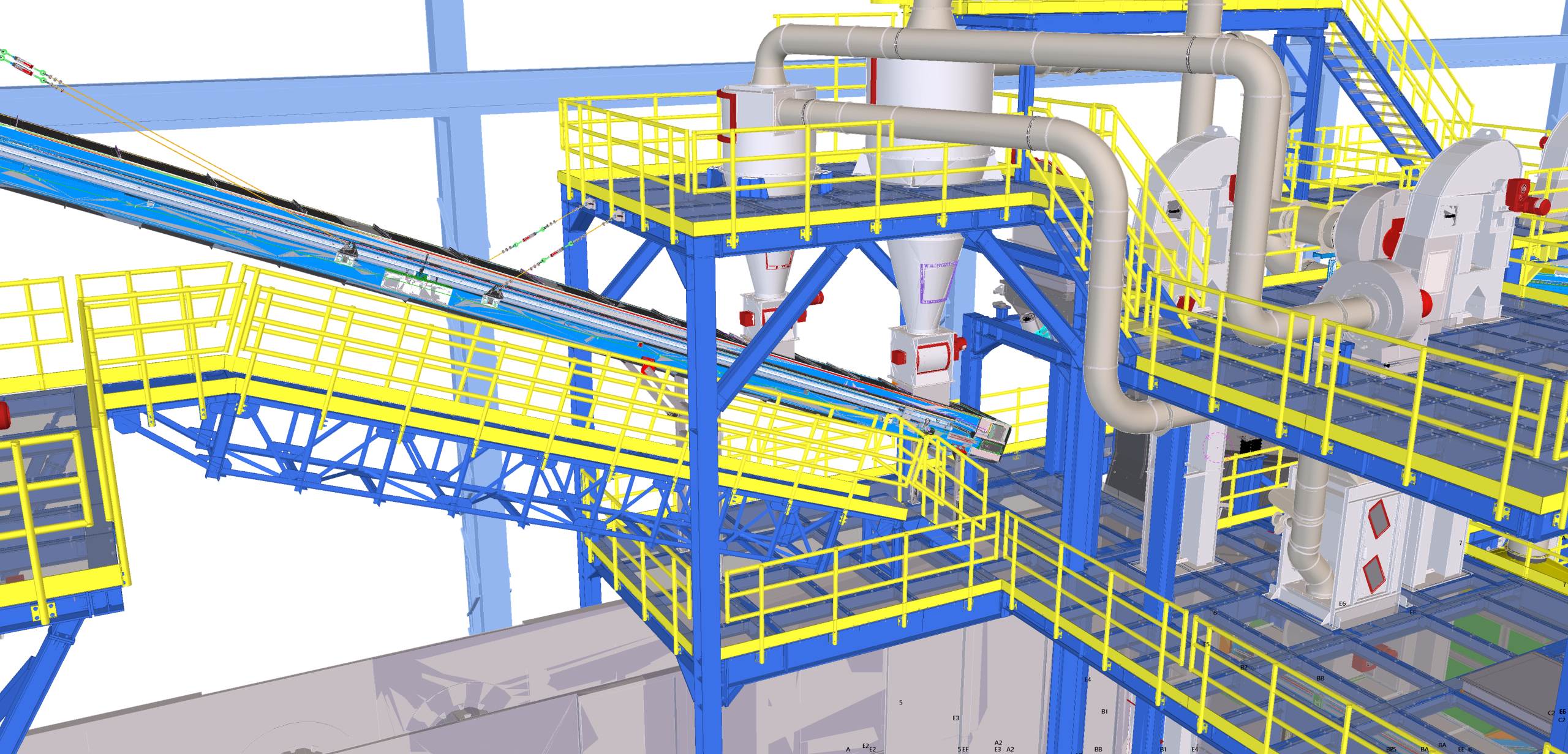 Pełny model 3D zaprojektowany i narysowany w TEKLA STRUCTURES. Obejmuje także główną stalową konstrukcję, która stanowi bezpośrednie wsparcie dla wszystkich maszyn technologicznych oraz pozostałego wyposażenia niezbędnego do konserwacji i sterowania maszynami, takimi jak balustrady, drabiny i schody, kraty pomostowe.