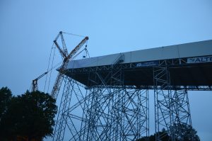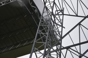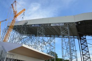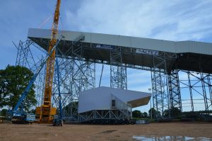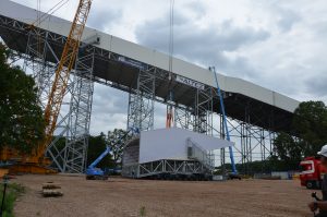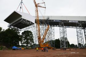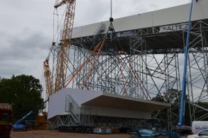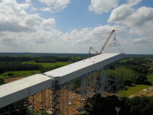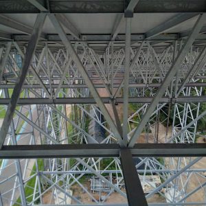 De constructie wordt vooraf gemonteerd in 5 modules op maaiveldniveau ,die dan na afkleding met een hoge kraan op de pijlerconstructie gehesen worden tot een hoogte van 65 meter. Per module wordt een gewicht gehesen van circa 125 ton. Een huzarenstukje op zich.
