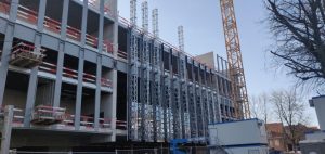 The conference-building consists of several floors. Including a meeting room with a ceilingheight of 9m. The load-bearing structure for the upper floor consists of 3 composite PRS profiles => length 27m, width 0.5m and a height of 1.5m. These are supported by HD columns that extend to the basement foundations.