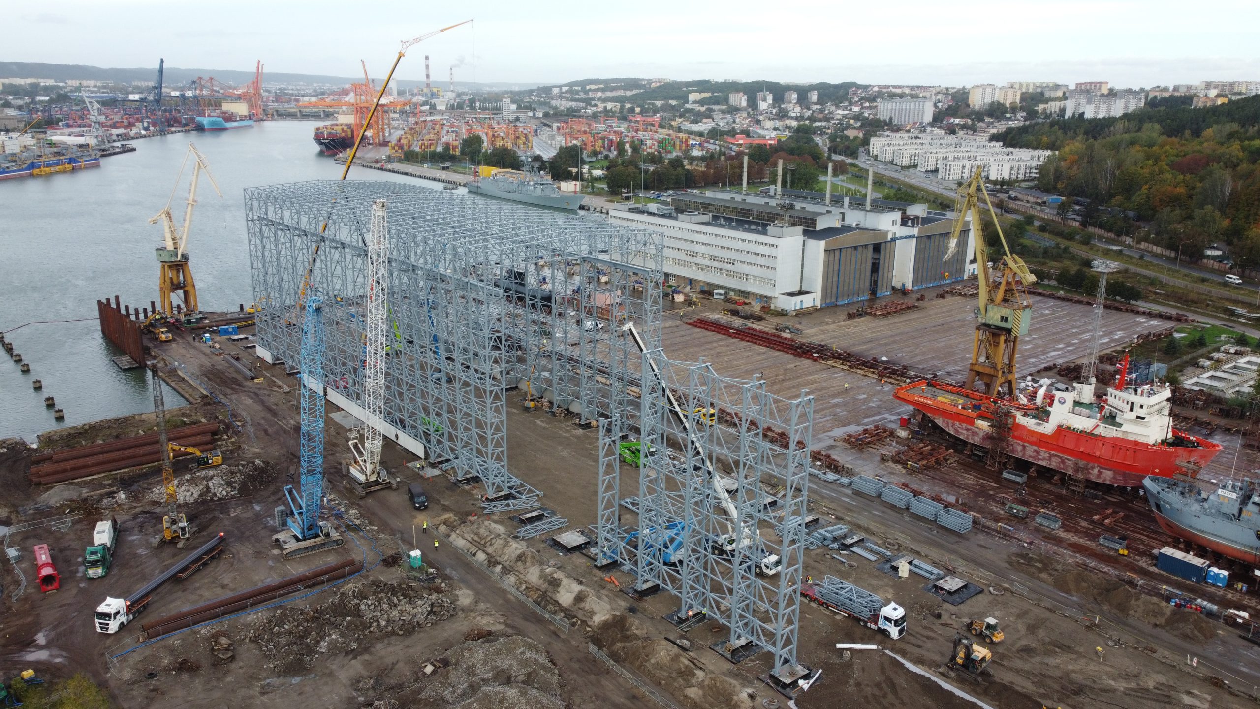 Mechanical gates on both „fronts” of the hall – the eastern gate allows for the free passage of the crane. The western gate with dimensions enabling free entry of individual sections of floating units and their launching. On the northern wall, a gate measuring approx. 5x5m.
