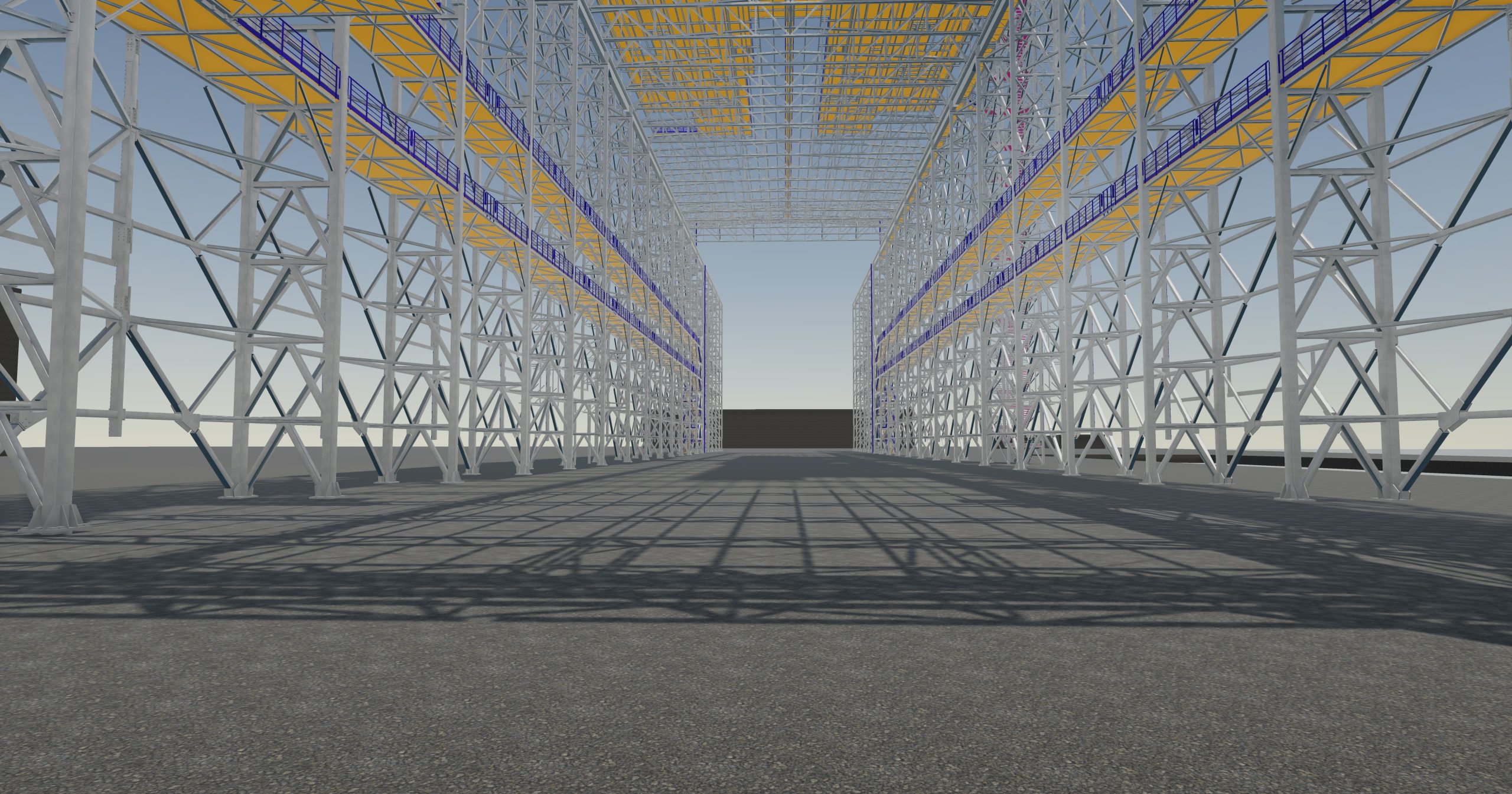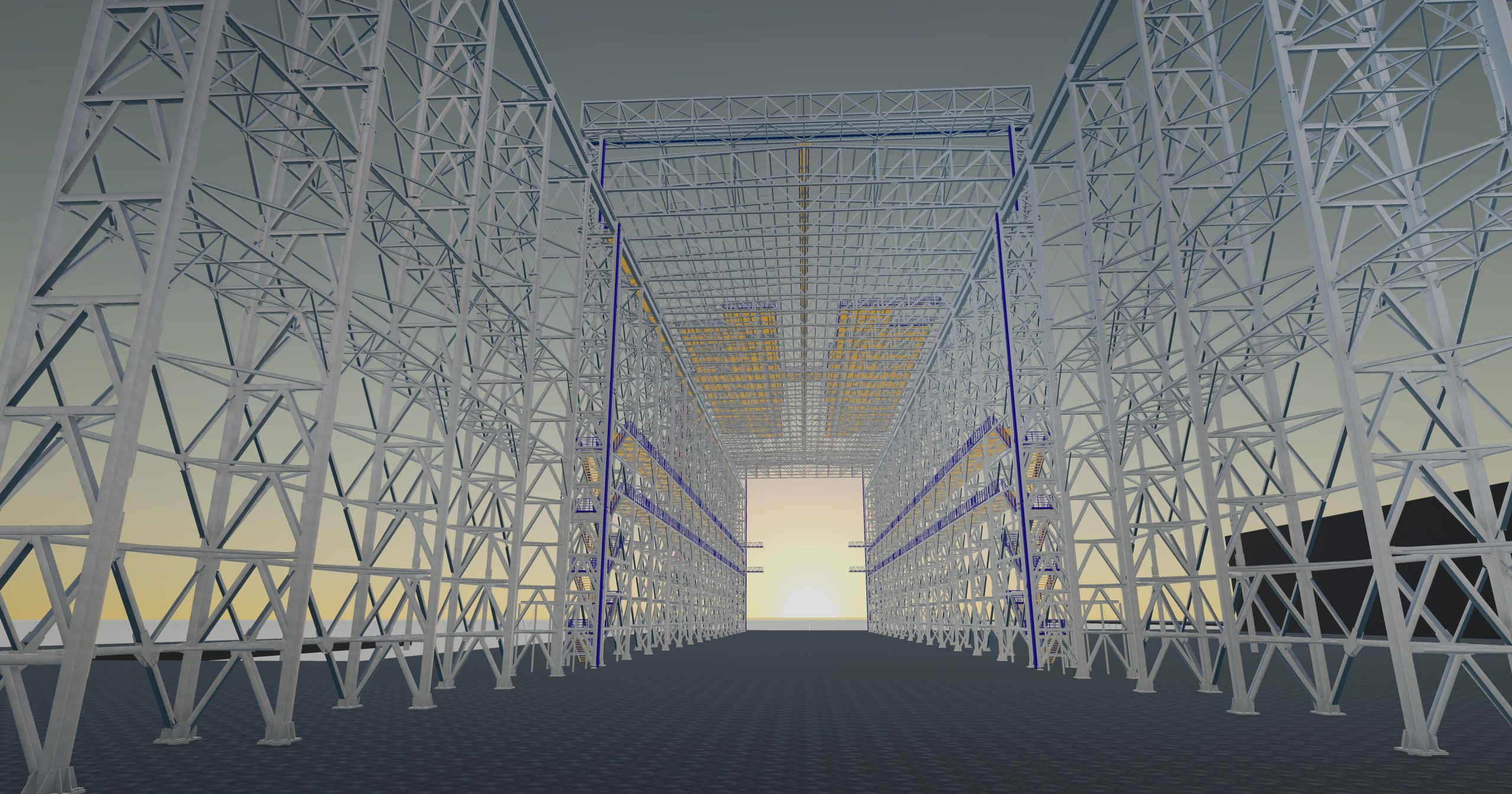 The designed Hull Hall with dimensions of ~154m in length, 38.5m in width and ~43m in height at the ridge. In the eastern part, an additional external viaduct consisting of lattice columns and a crane beam. Further expansion of the Hull Hall is possible by making additional girders connected to the viaduct columns and full roofing of the facility.