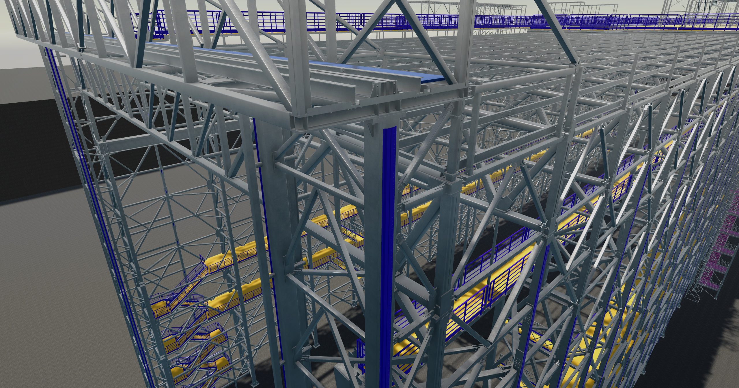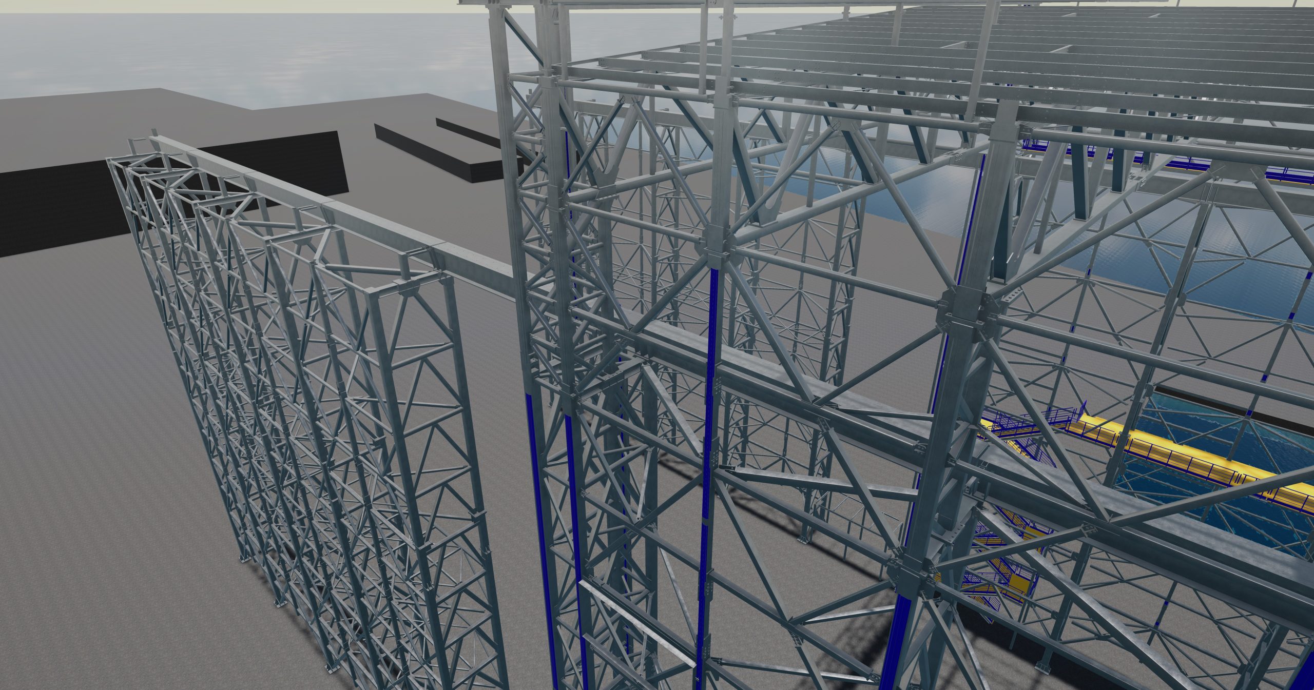 – steel structure of the hall walls, including: lower lattice columns, upper lattice columns, intermediate columns, vertical wall bracings, horizontal wall bracings