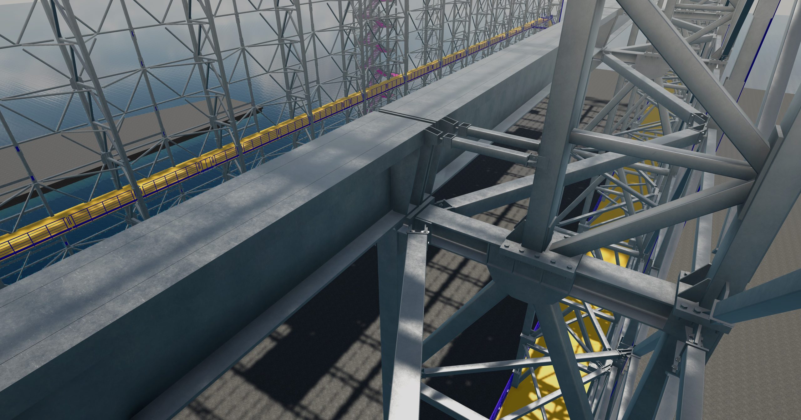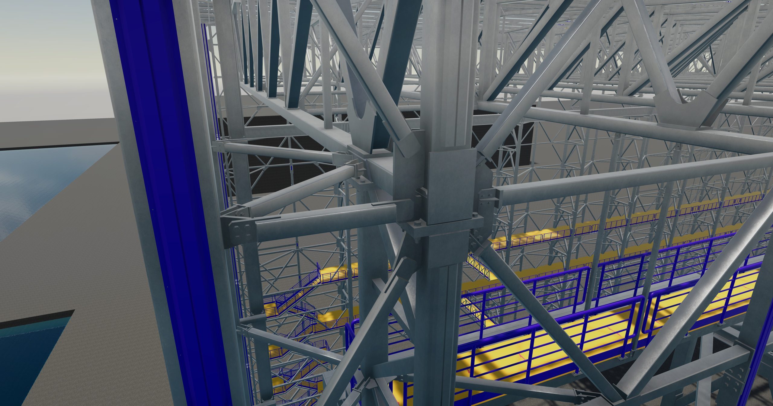 On levels +13.48 and +19.08 additional working platforms based on horizontal wall wind braces. Platforms necessary for proper communication, enabling the construction of a floating unit. Entrance to platforms via internal staircases located in the corners of the hall. In the southern part, in the immediate vicinity of the crane, an additional working platform as communication with the crane bridge and as an access element for its direct maintenance. On the roof, it is planned to make a large working platform in terms of area, connected directly to the roof structure. The number of support points of the working platform on the roof should be strictly limited in order to reduce places where vertical supporting elements penetrate the roof covering, which in places of penetrations requires significant work in order to shape an appropriate seal of the penetrations. A greater number of roof penetrations significantly increases the risk of the sheathing leaking and the occurrence of a defect that may affect the use of the building.