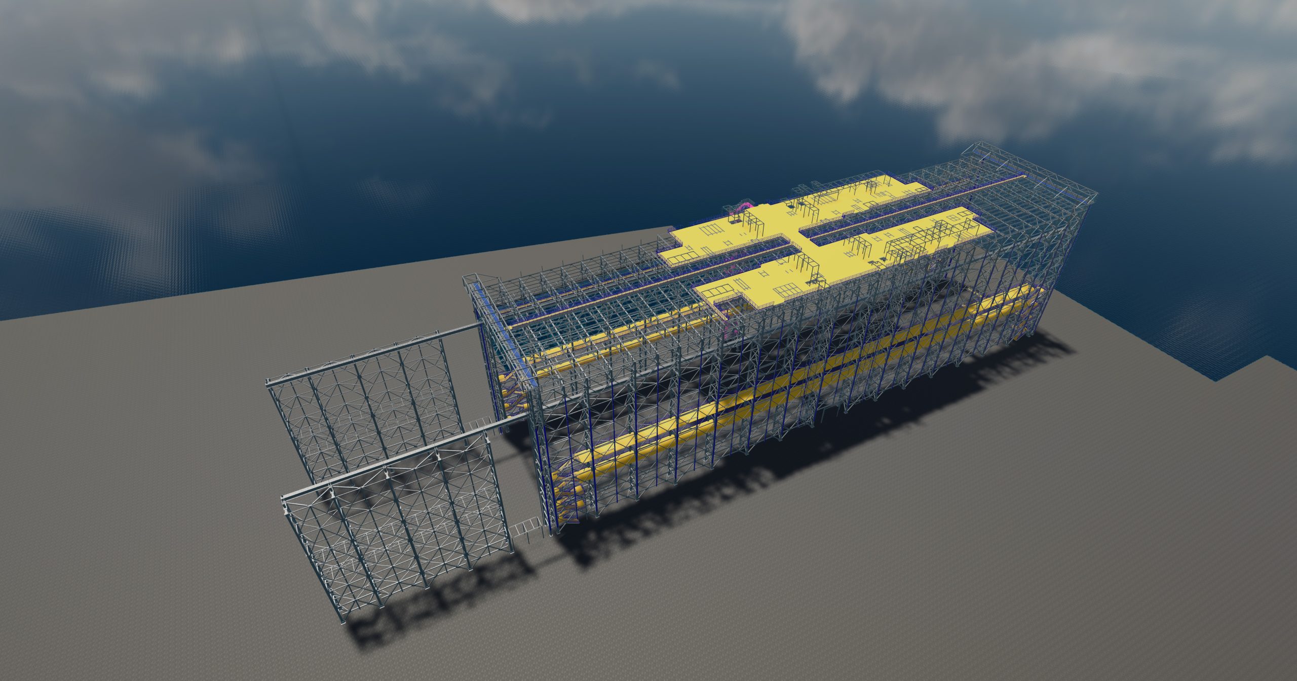 Projektowana Hala Kadłubowa o wymiarach ~154m długości, 38.5m szerokości oraz ~43m wysokości w kalenicy. W części wschodniej dodatkowa estakada zewnętrzna złożona ze słupów kratowych oraz belki podsuwnicowej. Możliwa dalsza rozbudowa Hali Kadłubowej poprzez wykonanie dodatkowych dźwigarów łączonych do słupów estakady oraz pełnego zadaszenia obiektu.