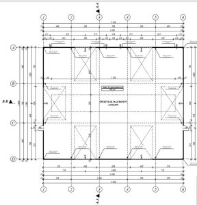 Zaprojektowana została hala jednonawowa w technologii stalowej prefabrykowanej z ryglami ściennymi. Hala ma wymiary 20 x 25m.Wysokość użytkowa, wewnątrz do najniższego punktu dźwigara wynosi ok 14m. Górny poziom kalenicy wynosi 15,50 m. Konstrukcja dachu składa się z dźwigarów kratowych przegubowo zamocowanych do słupów (układy główne) oraz rygli dachowych w postaci kształtowników walcowanych, sztywno zamocowanych w słupach (układy ścian szczytowych). Schemat poprzeczny hali składa się ze słupów prefabrykowanych sztywno zamocowanych w fundamencie żelbetowym monolitycznym, przegubowo połączonych z dźwigarami kratowymi (układy główne) oraz sztywno zamocowanych rygli dachowych ( układy poprzeczne ścian szczytowych). Usztywnienia przestrzenne w ścianach stanowią stężenia pionowe prętowe, a w dachu zastosowano klasyczne rozwiązanie stężeniami typu X. Poszycie dachu stanowi płyta warstwowa oparta na płatwiach.
