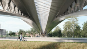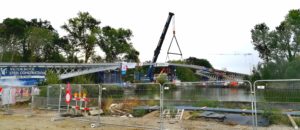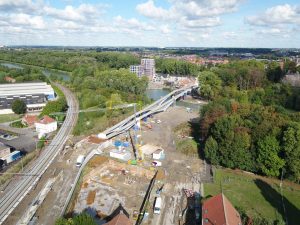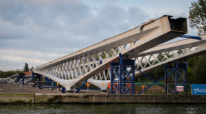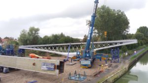 The new village bridge of Ingelmunster will replace the old bridge. The old concrete bridge was completely demolished and replaced by a new steel bridge with a larger span which also allows a channel widening. The new steel bridge consists of a steel caisson arch and a bridge deck in concrete. The bridge is an arch bridge with 3 spans with a full arc and 2 spans with a half arc that end at the abutment.