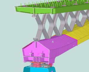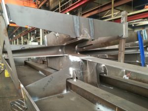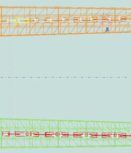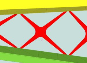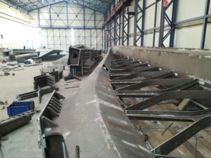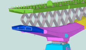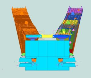 The difficulty of this bridge is mainly in the geometry (nothing is straight or perpendicular) and the many twisted plates that sometimes end up in half tubes. Also the web and the flanges of the cross-shaped connections are not at right angles to each other, but the flanges of both diverging caisons run in line with each other and the soul then follow the direction of the caisson on which they are welded.