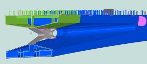 In the longitudinal direction there are 2 caisson that start together but are quickly split to the middle and come together again at the end. The total length is 286 m.