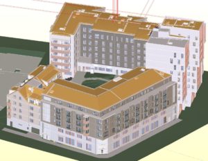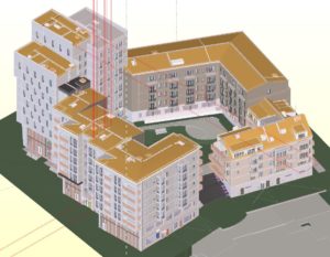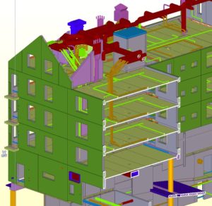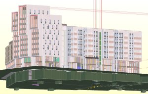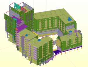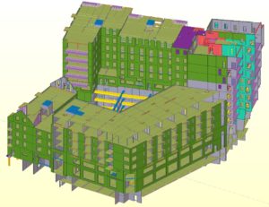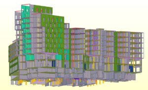 Przesłany przez nas model to etap pierwszy kompleksu budynków mieszkalnych w Szwecji. Model ten składa się z 6 budynków i garażu podziemnego. Z powodu ograniczeń sprzętowych musieliśmy podzielić generalny model na 3 modele po 2 budynki w każdym. Z wyjątkiem fundamentów, cała konstrukcja została zaprojektowana jako prefabrykowana betonowa z elementami stalowymi. Mieliśmy do czynienia z elementami prefabrykowanymi takimi jak: ściany pełne, ściany typu half-sandwich, ściany zespolone, słupy, belki, płyty typu Filigran, płyty pełne, słupki stalowe i belki stalowe.