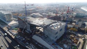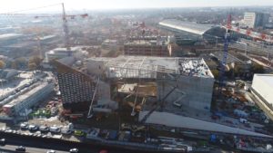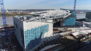 A obra é composta por 2 núcleos de betão armado unidos entre si através de treliças metálicas sobre as quais foram aplicadas lajes mistas de betão armado para a execução dos respectivos pisos. Na zona da cobertura e fachadas foram ainda aplicadas vigas metálicas sobre as quais foi aplicada a estrutura pré-fabricada de revestimento. Complexidade da geometria da obra que obrigou à execução de ligações arrojadas na estrutura metálica. A complexidade das ligações entre a estrutura metálica e a estrutura de betão armado foram também um desafio devido à geometria e ângulos da estrutura metálica. A boa coordenação e abertura existente entre arquitecto, projectista e direção-de-obra que levou a que fossem discutidas e aprovadas soluções de elevada complexidade na execução ded toda a estrutura metálica.