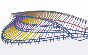De secundaire staalconstructie wordt volledig in het model uitgewerkt. Na afstemming met de onderdelen voor de tertiaire constructie, en na controle van TGM op basis van de IFC, wordt dit Tekla-model apart opgeslagen en uitgewisseld met staalleverancier Moeskops. Zij maken hier vervolgens productietekeningen van in hun eigen Tekla-omgeving. TGM verzorgt montagetekeningen op basis van de IFC.