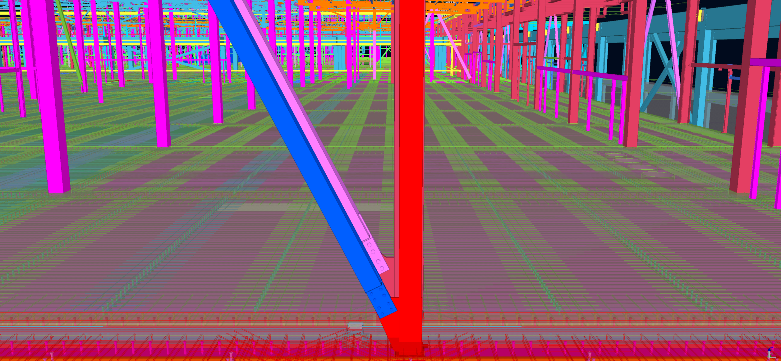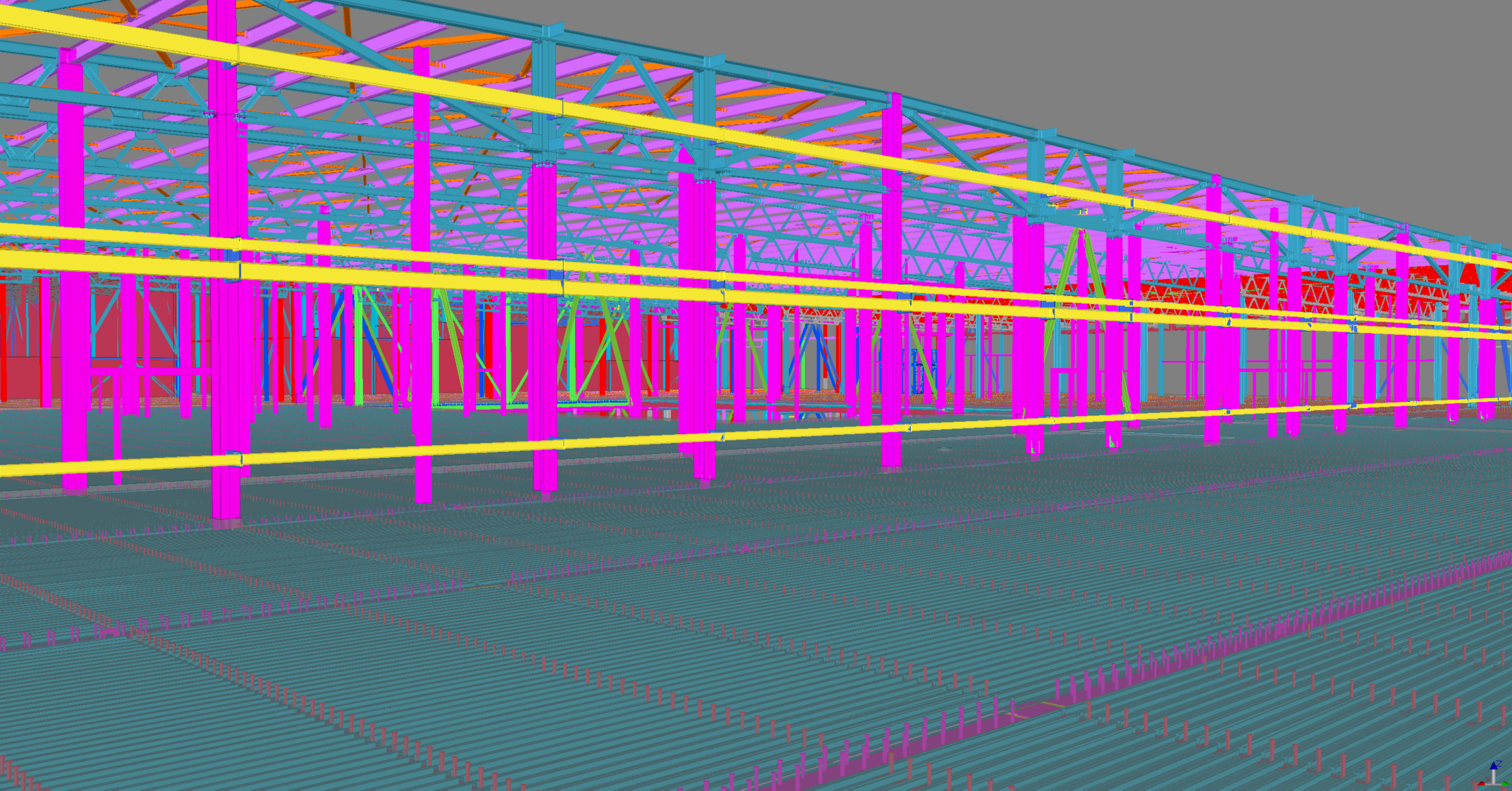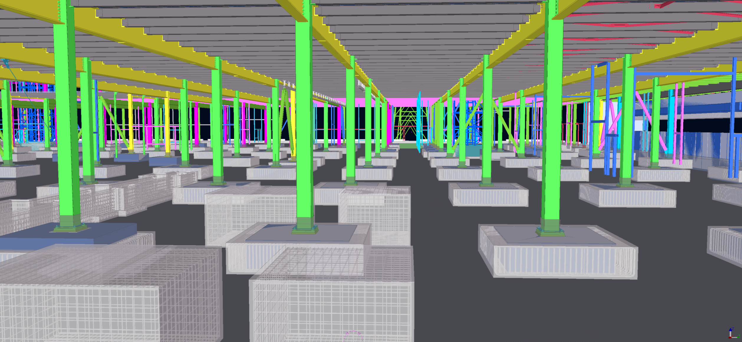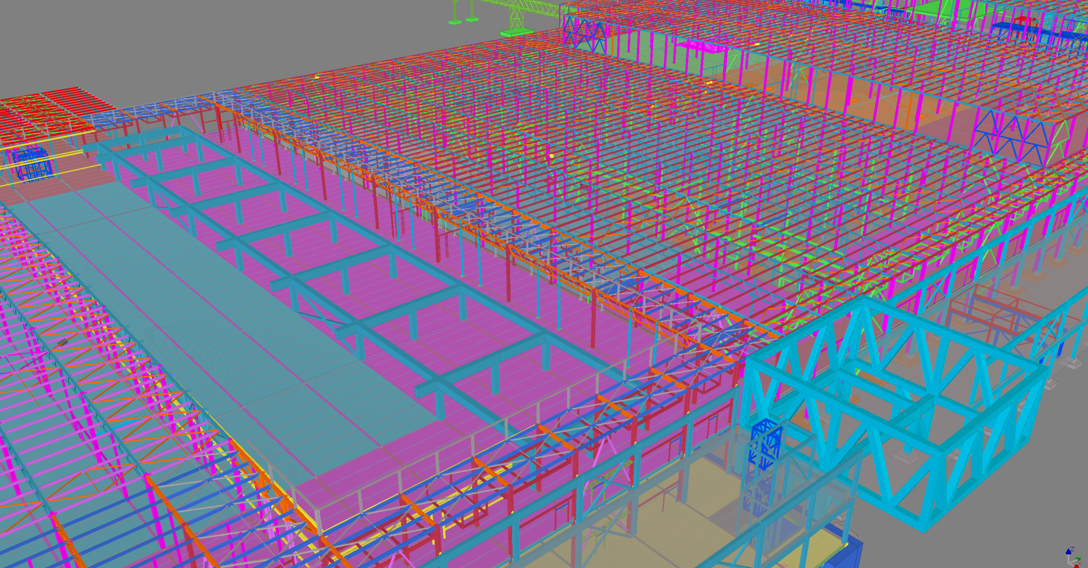 Już od pierwszych etapów opracowano kompletny model 3D obiektu w Tekla Structures. Każdy element – belki, słupy, płyty i połączenia – został szczegółowo zamodelowany, a rysunki warsztatowe i pliki CNC były generowane bezpośrednio z modelu. Integracja międzybranżowa pozwoliła połączyć w jednym środowisku elementy konstrukcyjne, architektoniczne i instalacyjne (MEP), skutecznie eliminując kolizje projektowe i ograniczając konieczność poprawek na budowie.