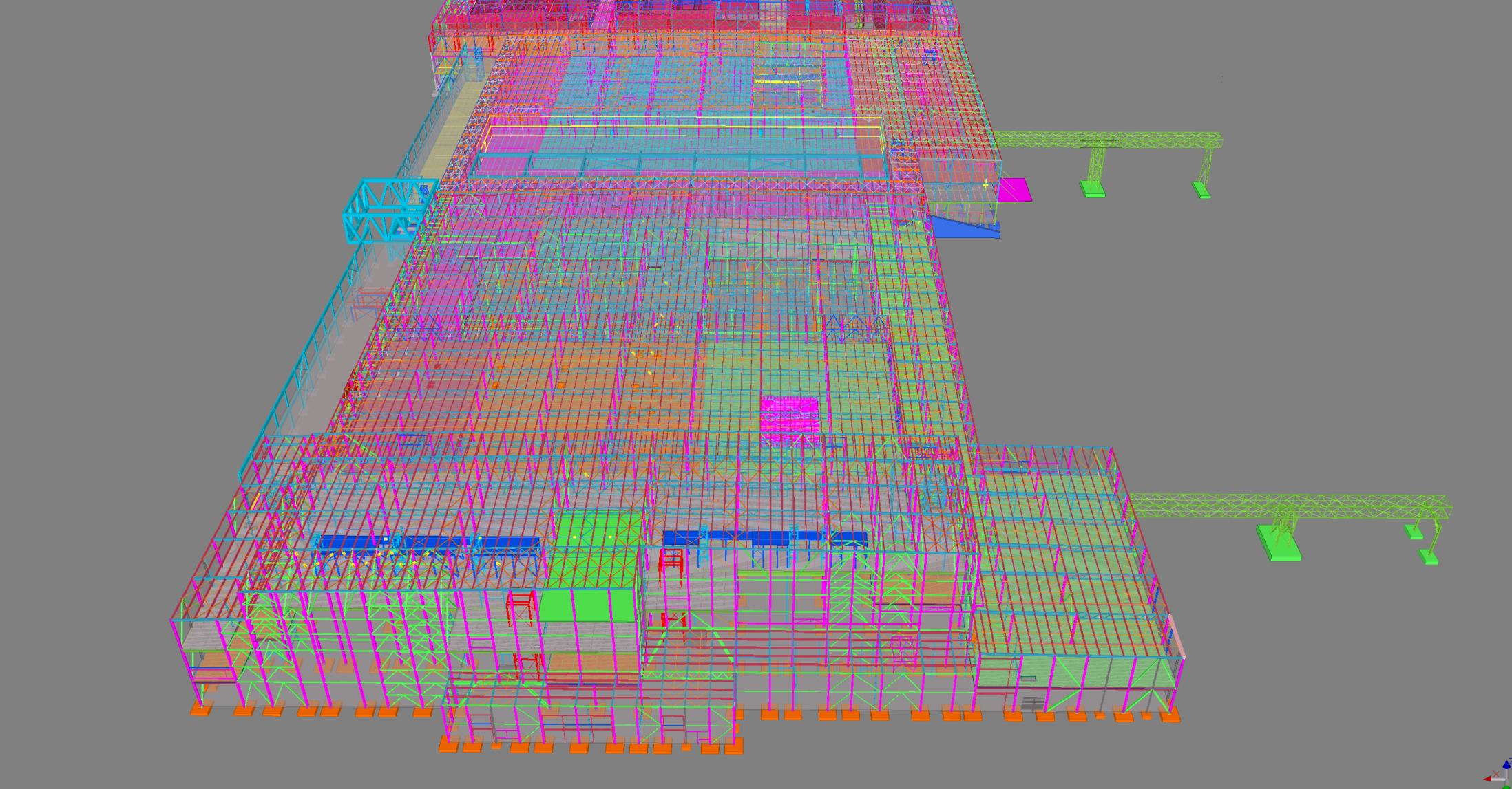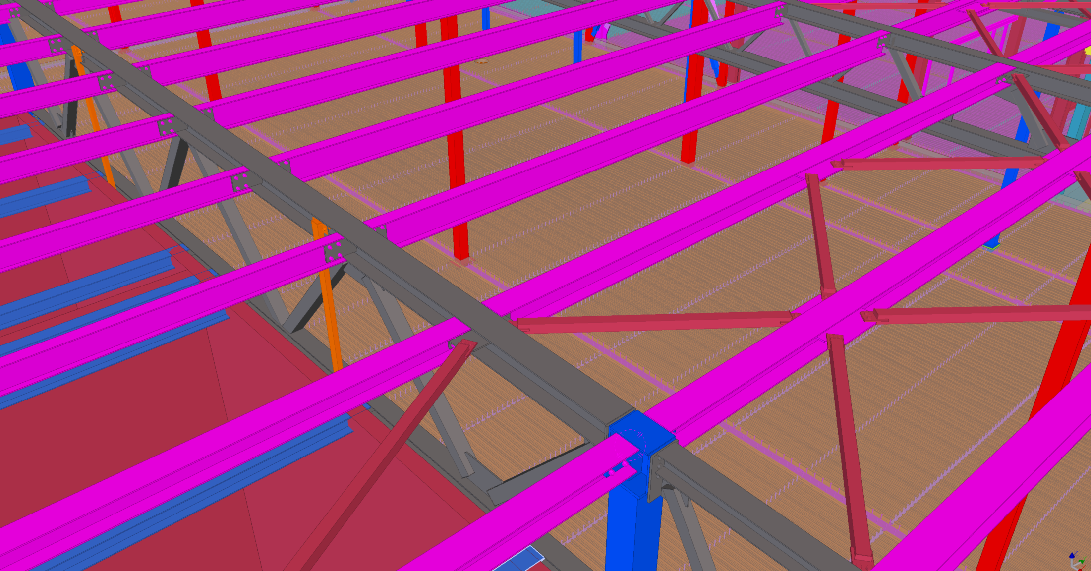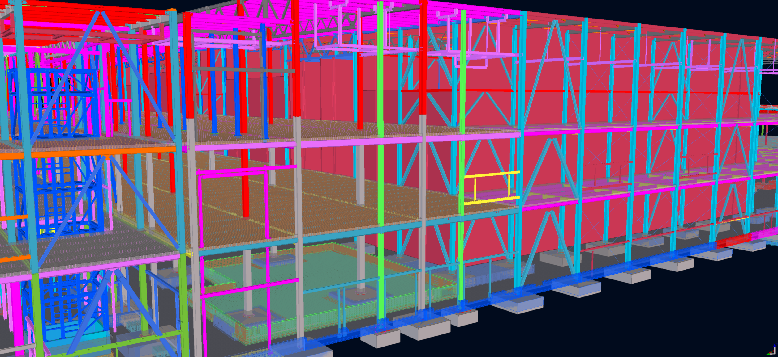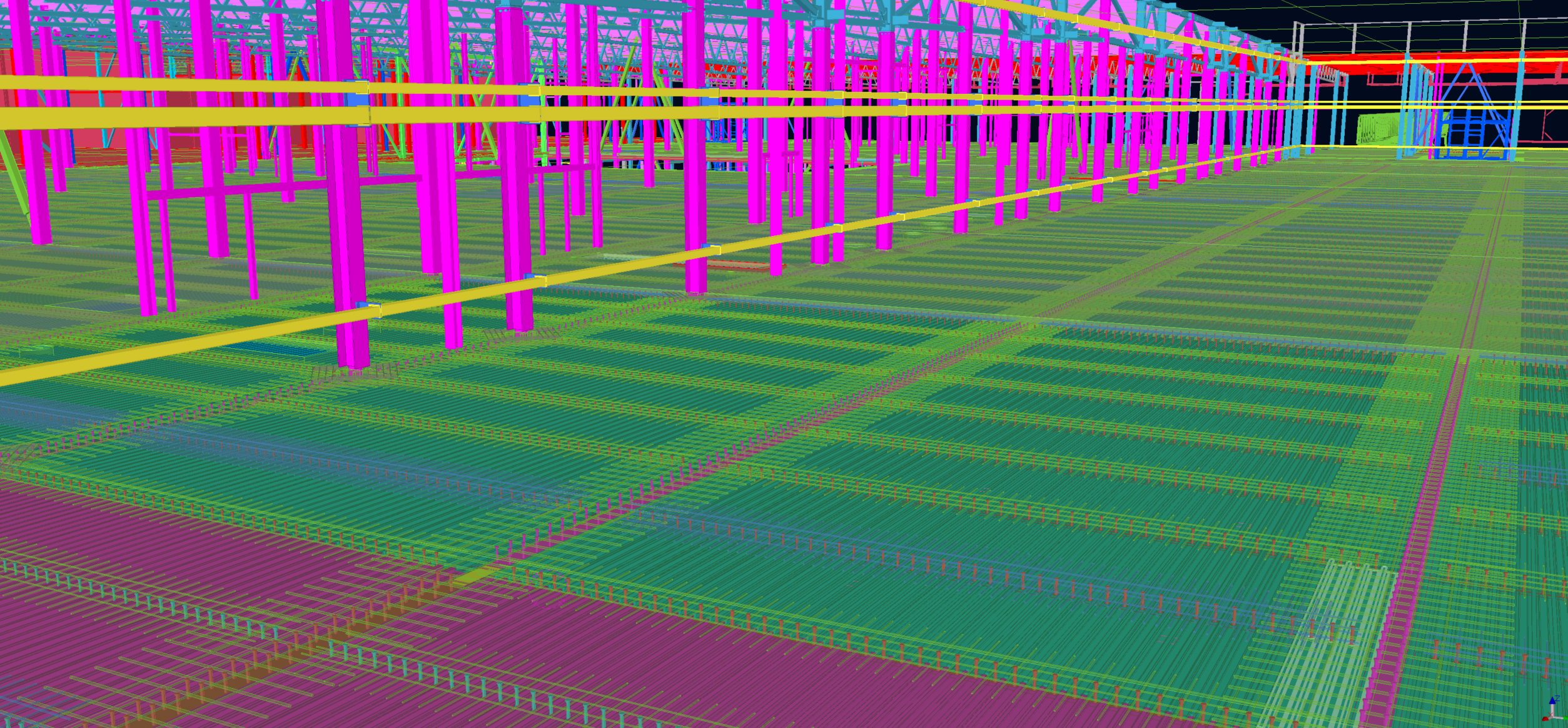 Już od pierwszych etapów opracowano kompletny model 3D obiektu w Tekla Structures. Każdy element – belki, słupy, płyty i połączenia – został szczegółowo zamodelowany, a rysunki warsztatowe i pliki CNC były generowane bezpośrednio z modelu. Integracja międzybranżowa pozwoliła połączyć w jednym środowisku elementy konstrukcyjne, architektoniczne i instalacyjne (MEP), skutecznie eliminując kolizje projektowe i ograniczając konieczność poprawek na budowie.