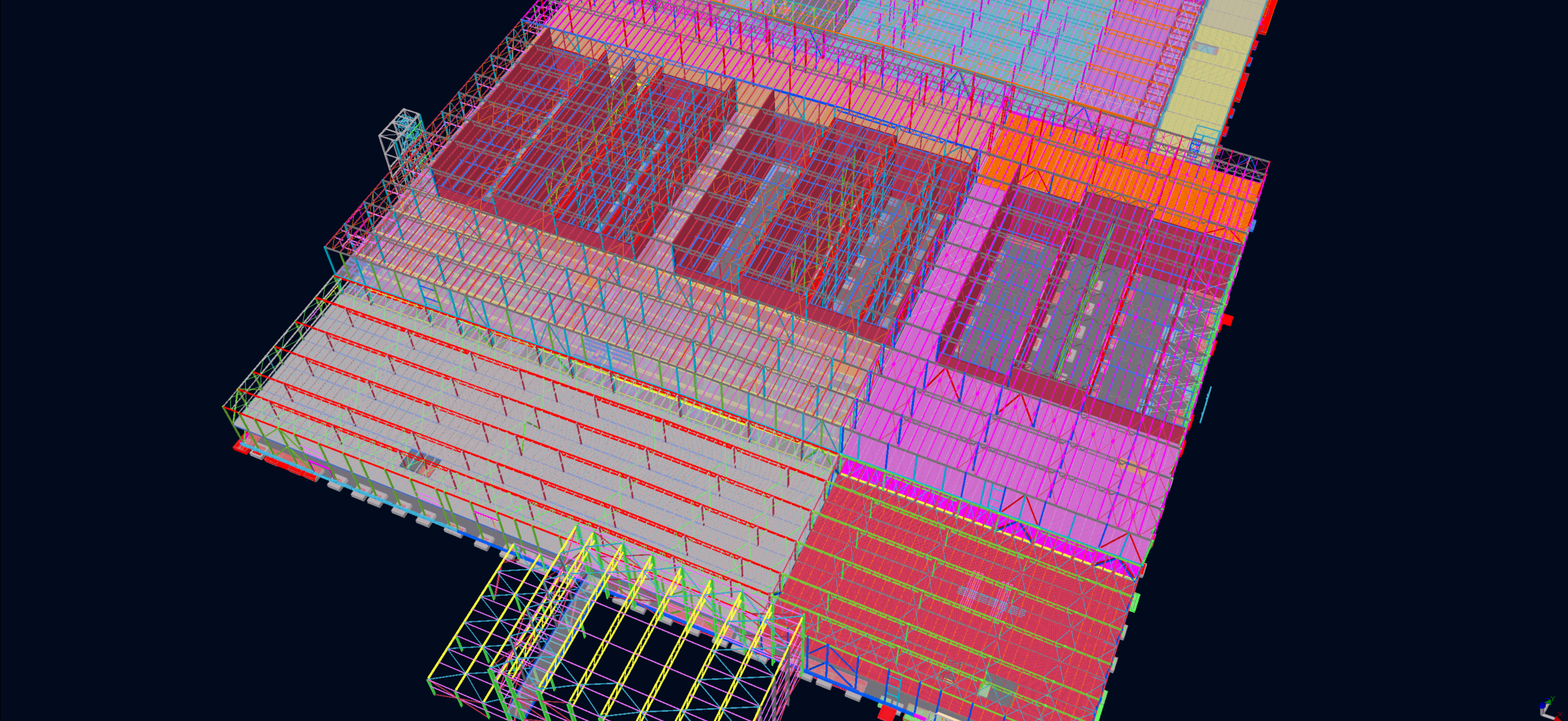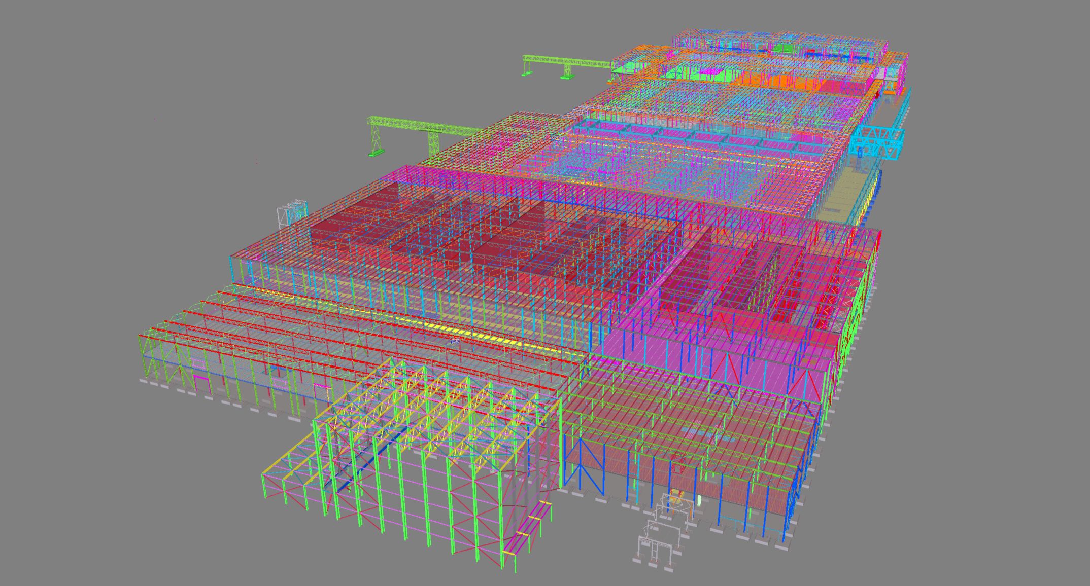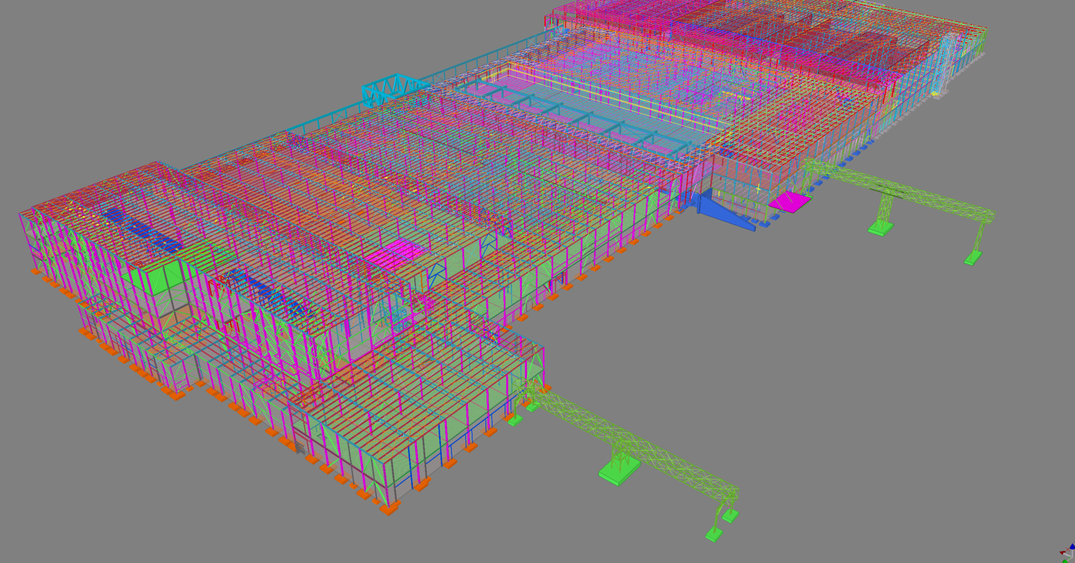 From the start, a full 3D model of the facility was developed in Tekla Structures. Every beam, column, slab, and connection was detailed, with shop drawings and CNC files generated directly from the model. Multidisciplinary integration brought structural, architectural, and MEP elements into a shared environment, helping avoid design clashes and reducing rework on-site.